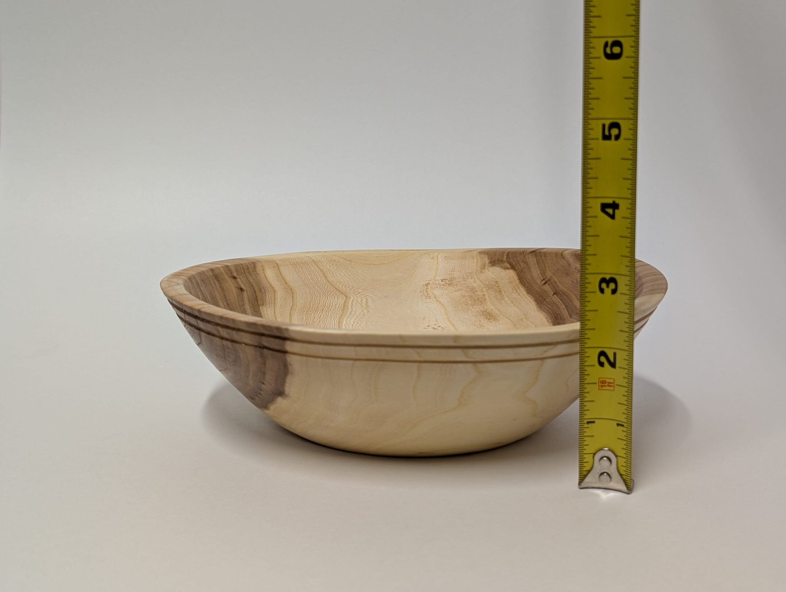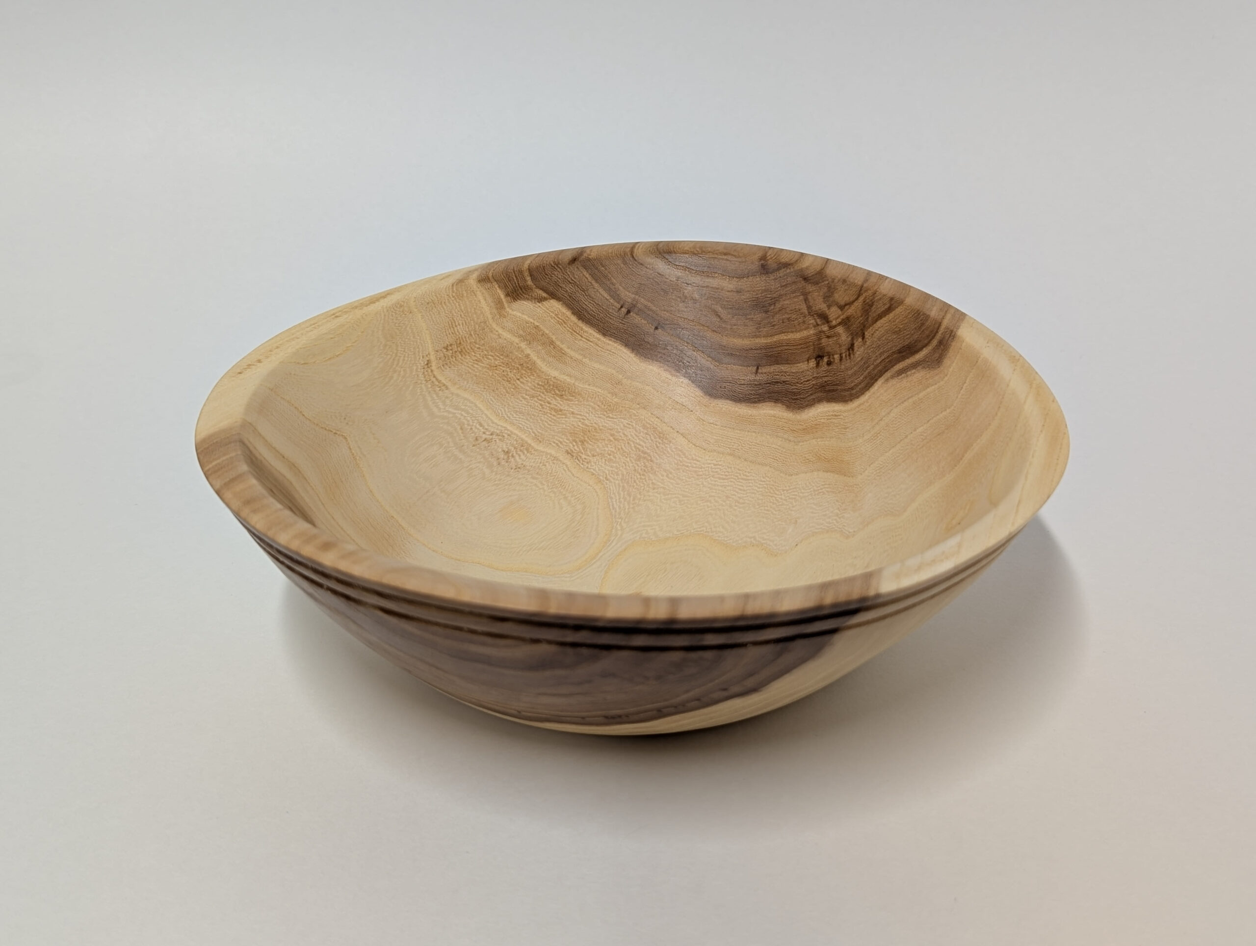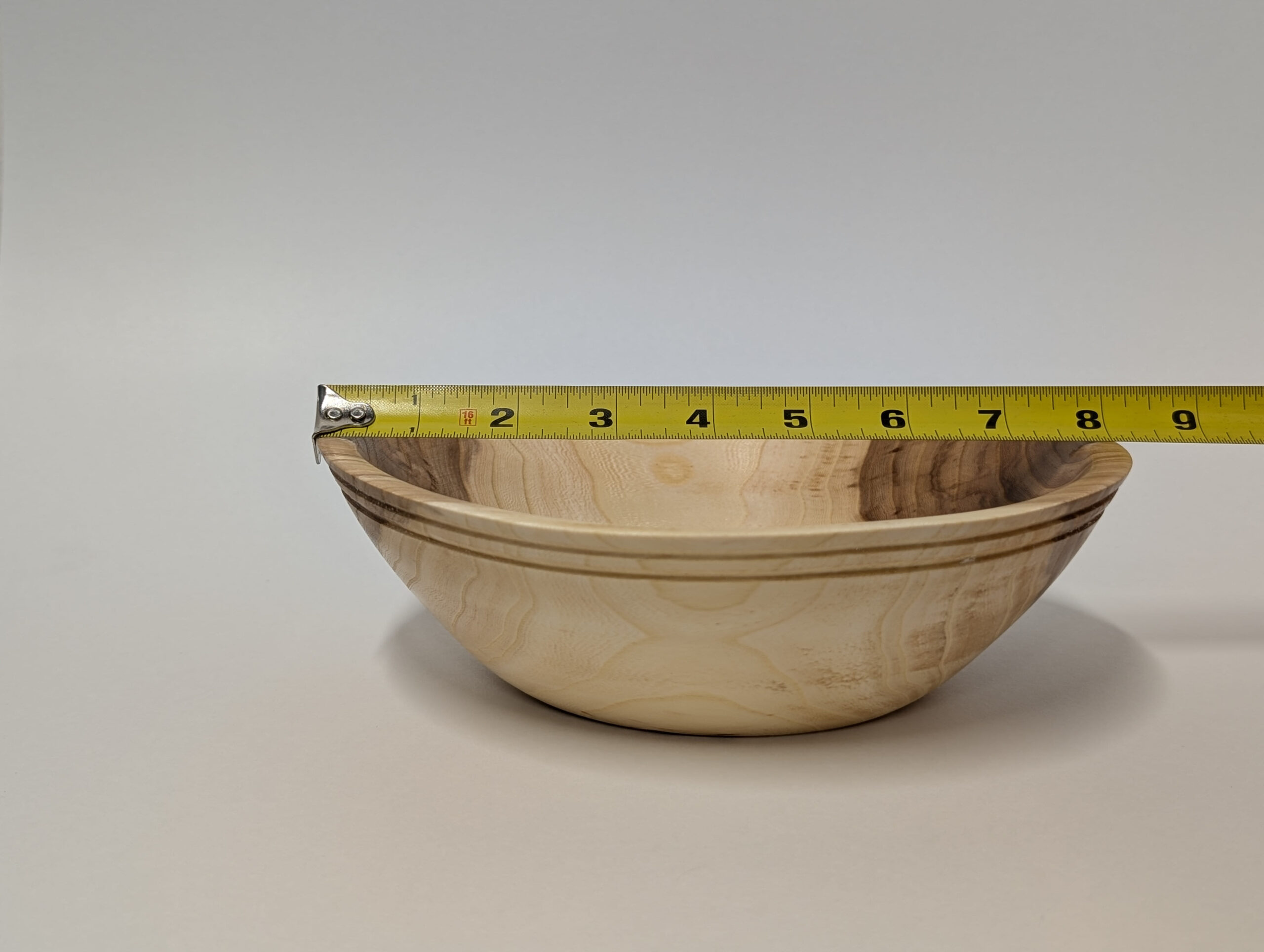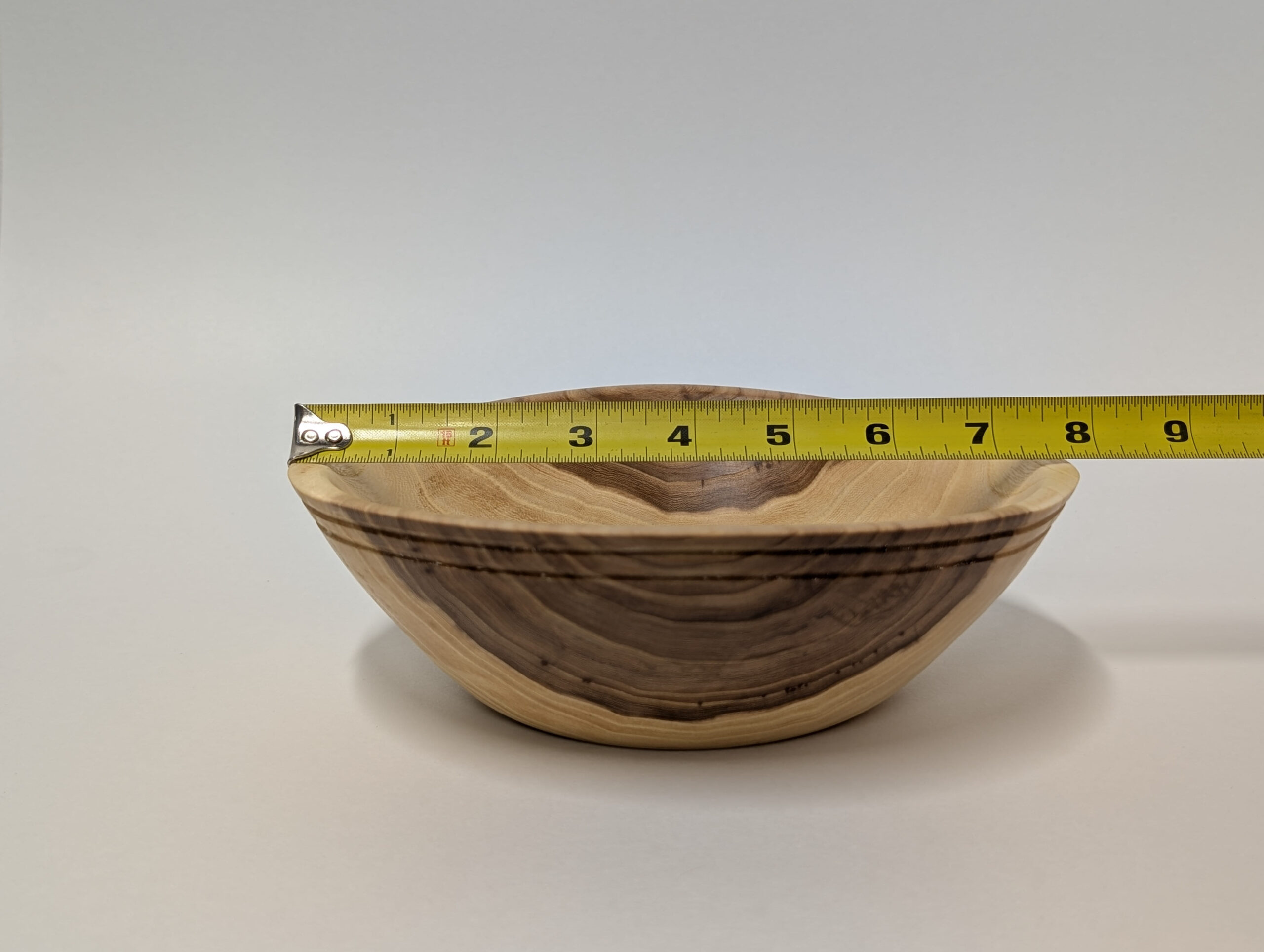Elm wood bowl. Dimensions: Approximately 7.75 inches in diameter, and 2.25 inches in height. Finished with walnut oil and carnauba wax.