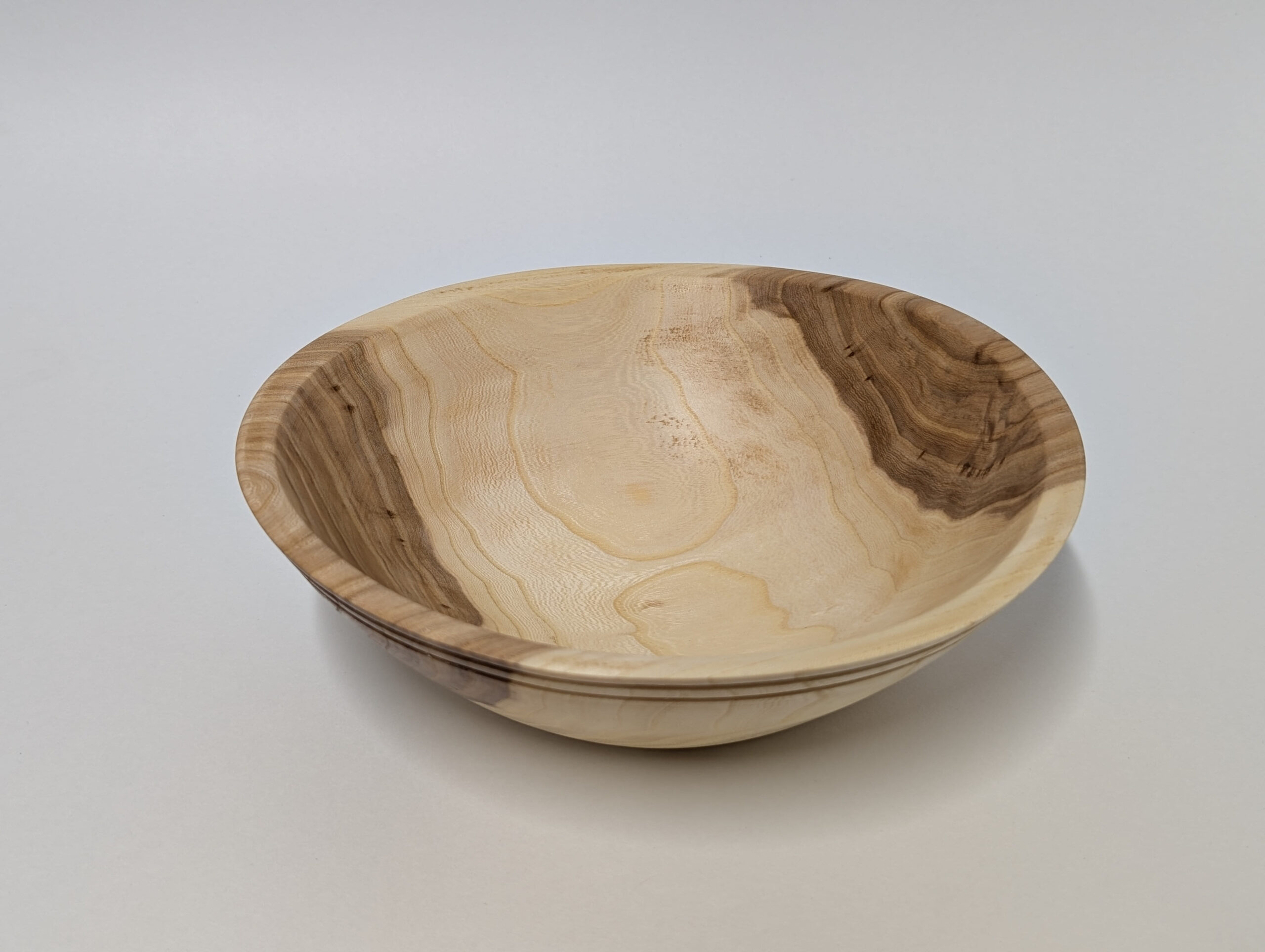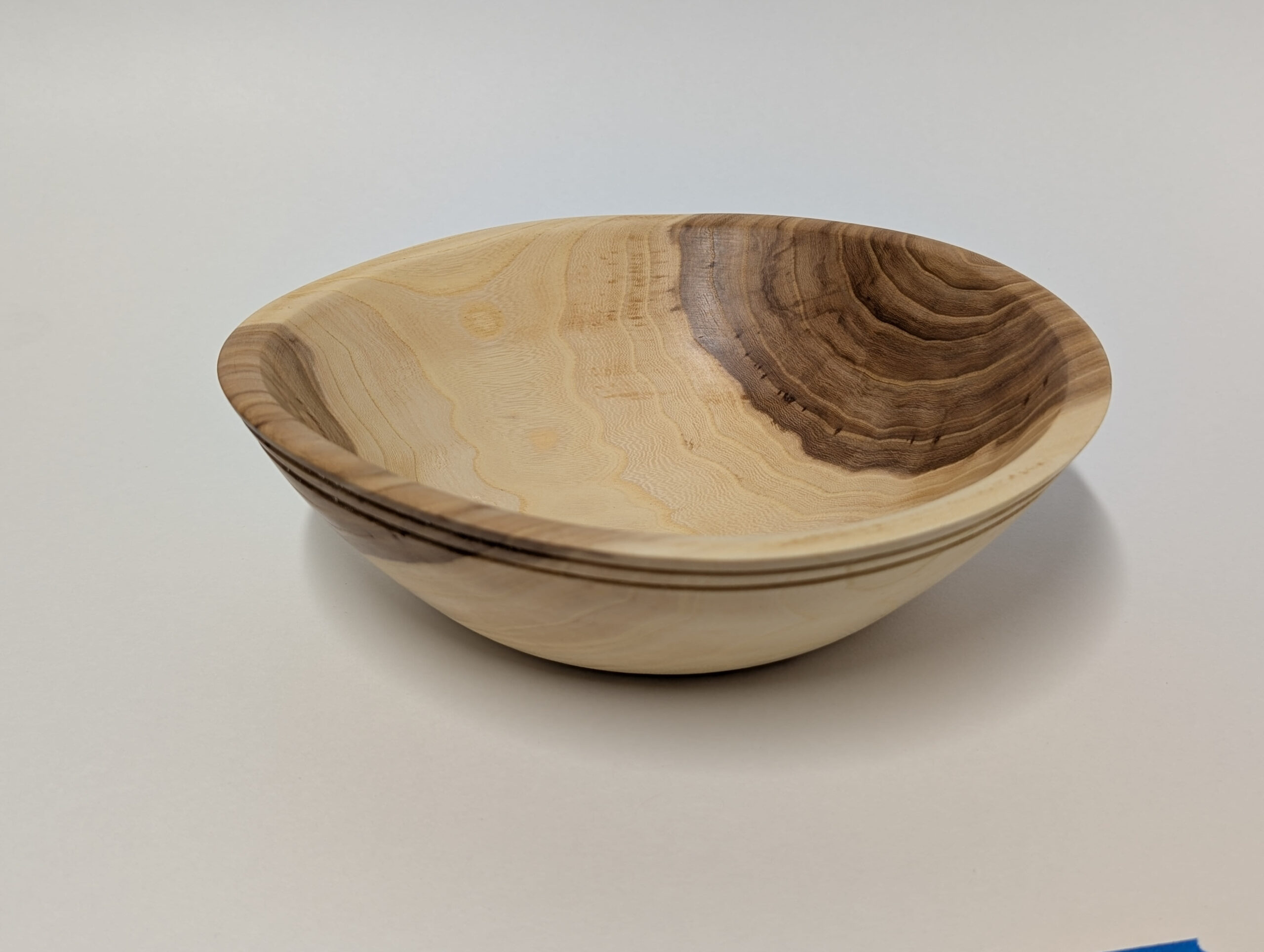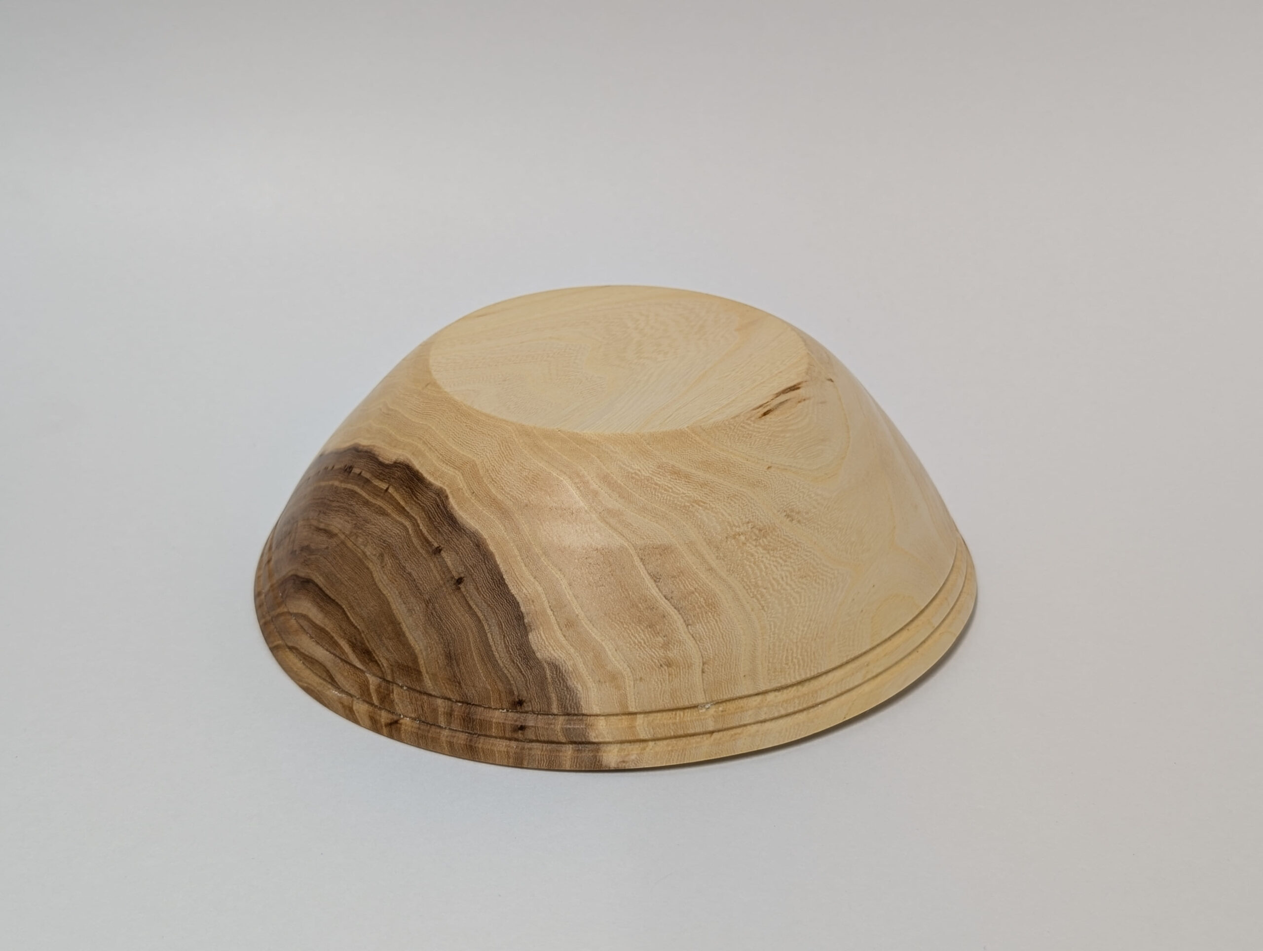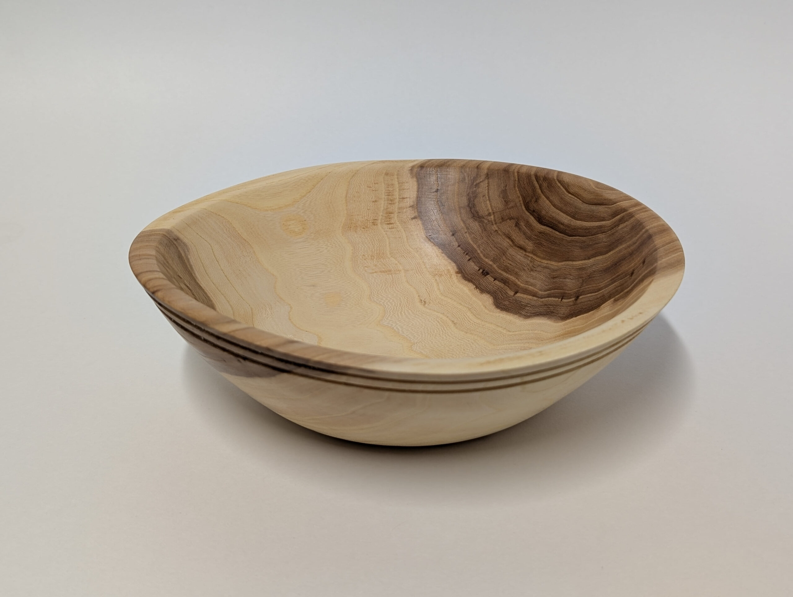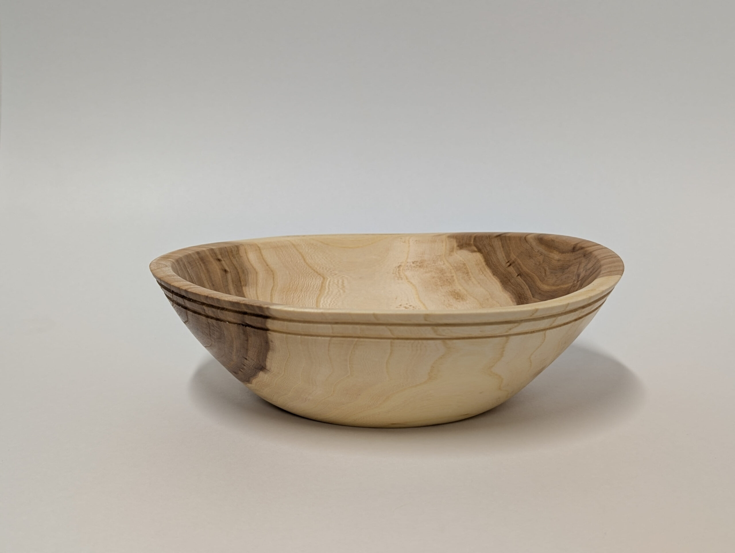 Elm wood bowl. Dimensions: Approximately 7.75 inches in diameter, and 2.25 inches in height. Finished with walnut oil and carnauba wax.