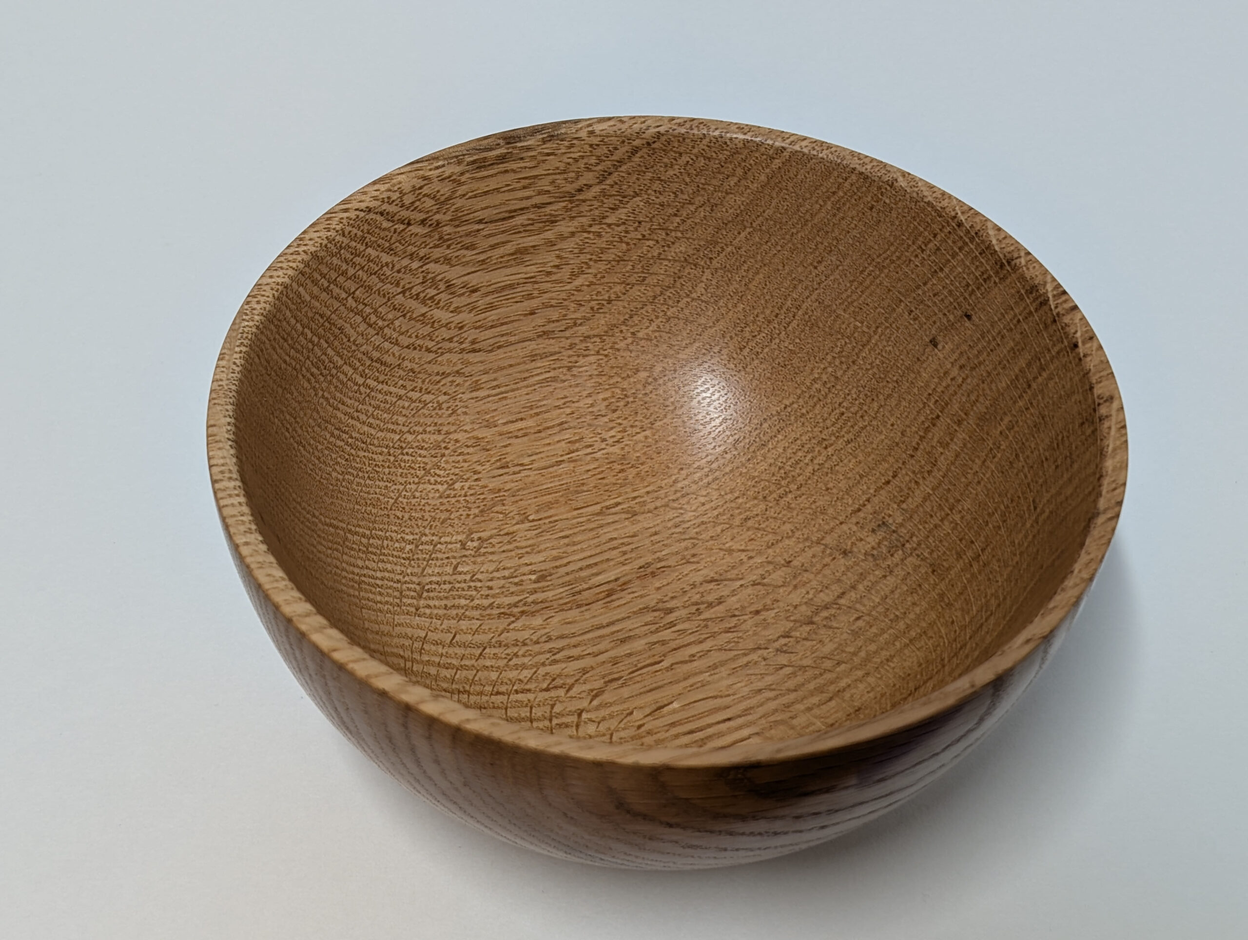 Oak wood bowl. Dimensions: Approximately 5.375 inches in diameter, and 2.5 inches in height. Finished with walnut oil and carnauba wax.