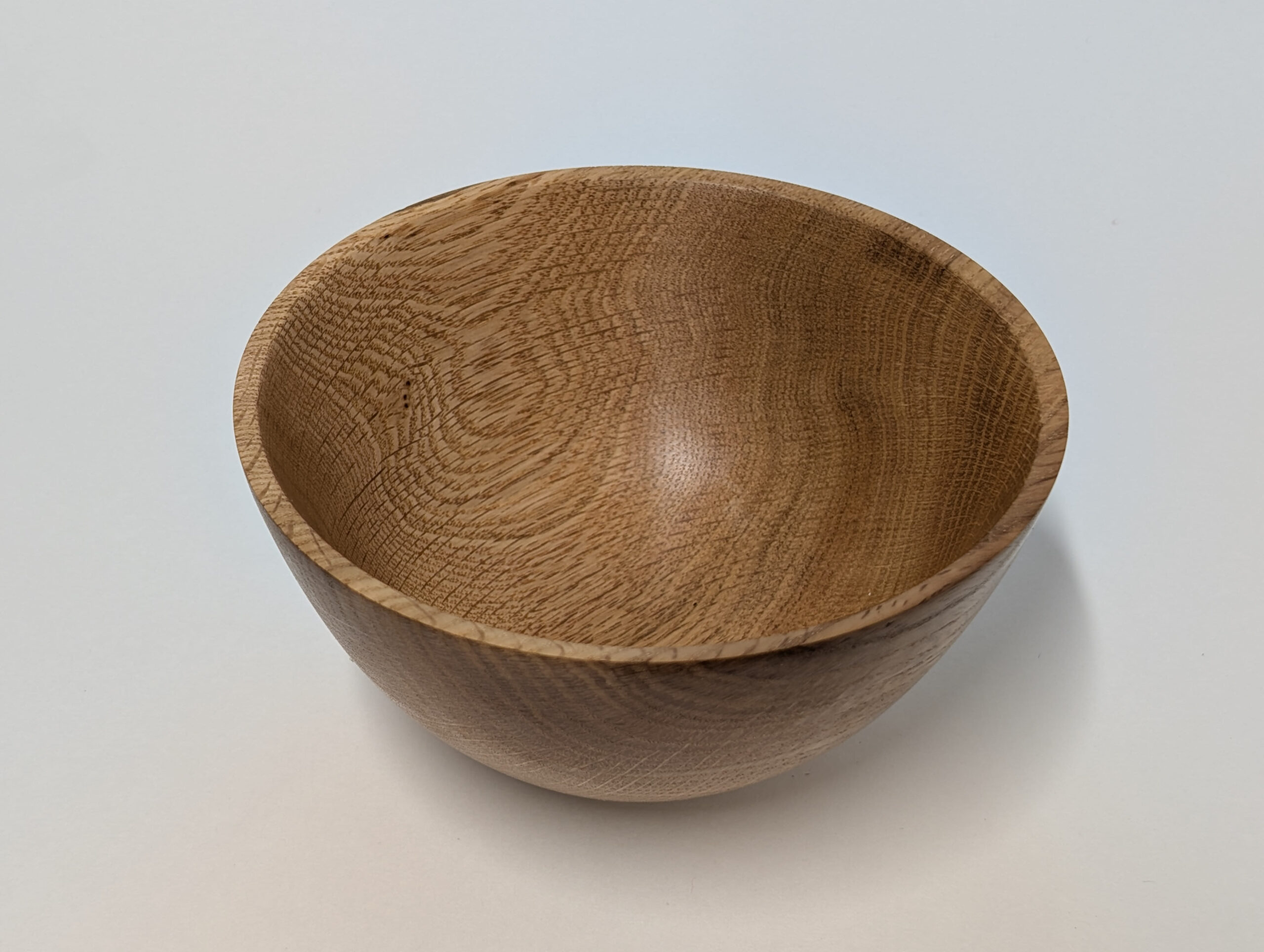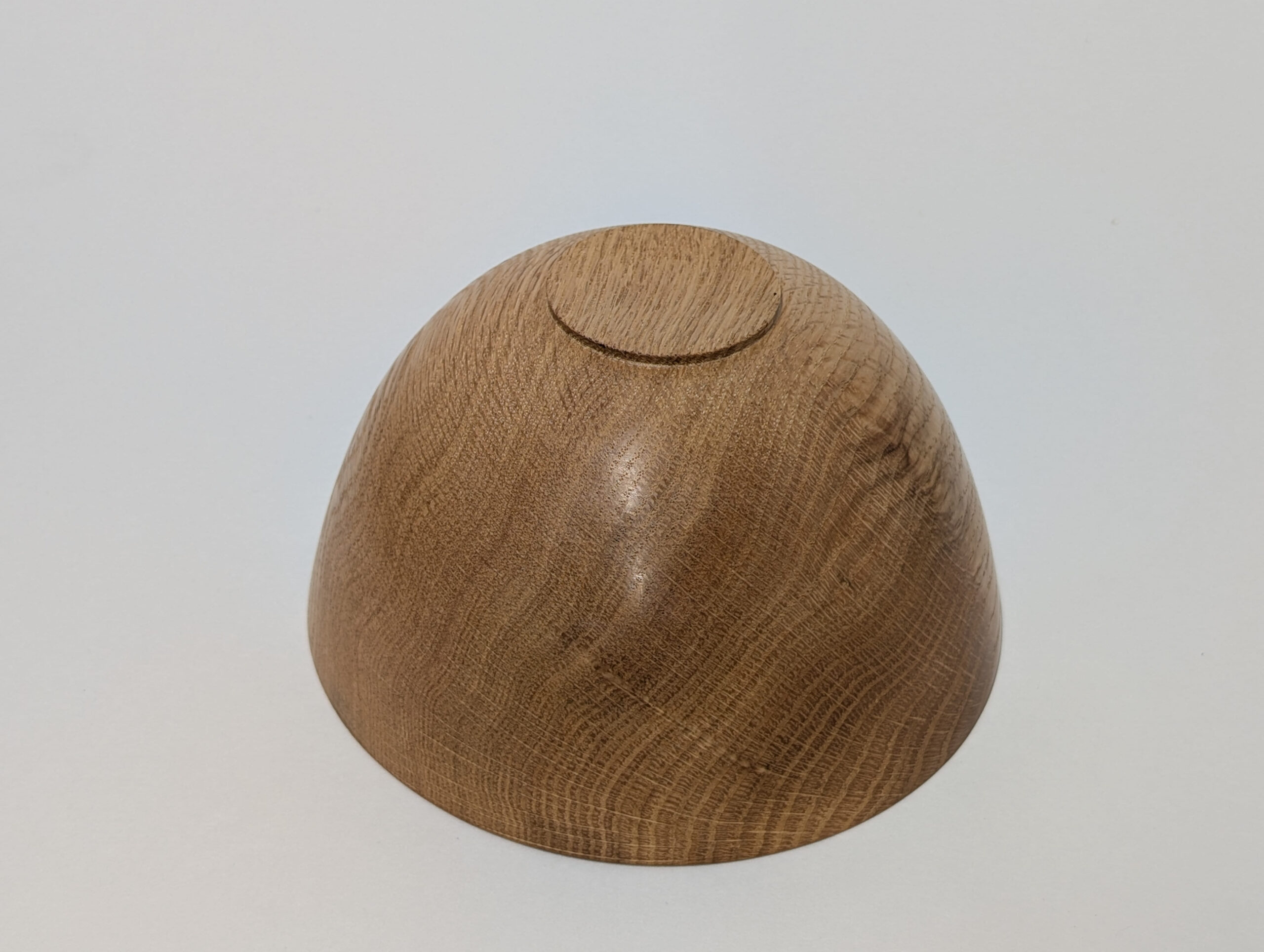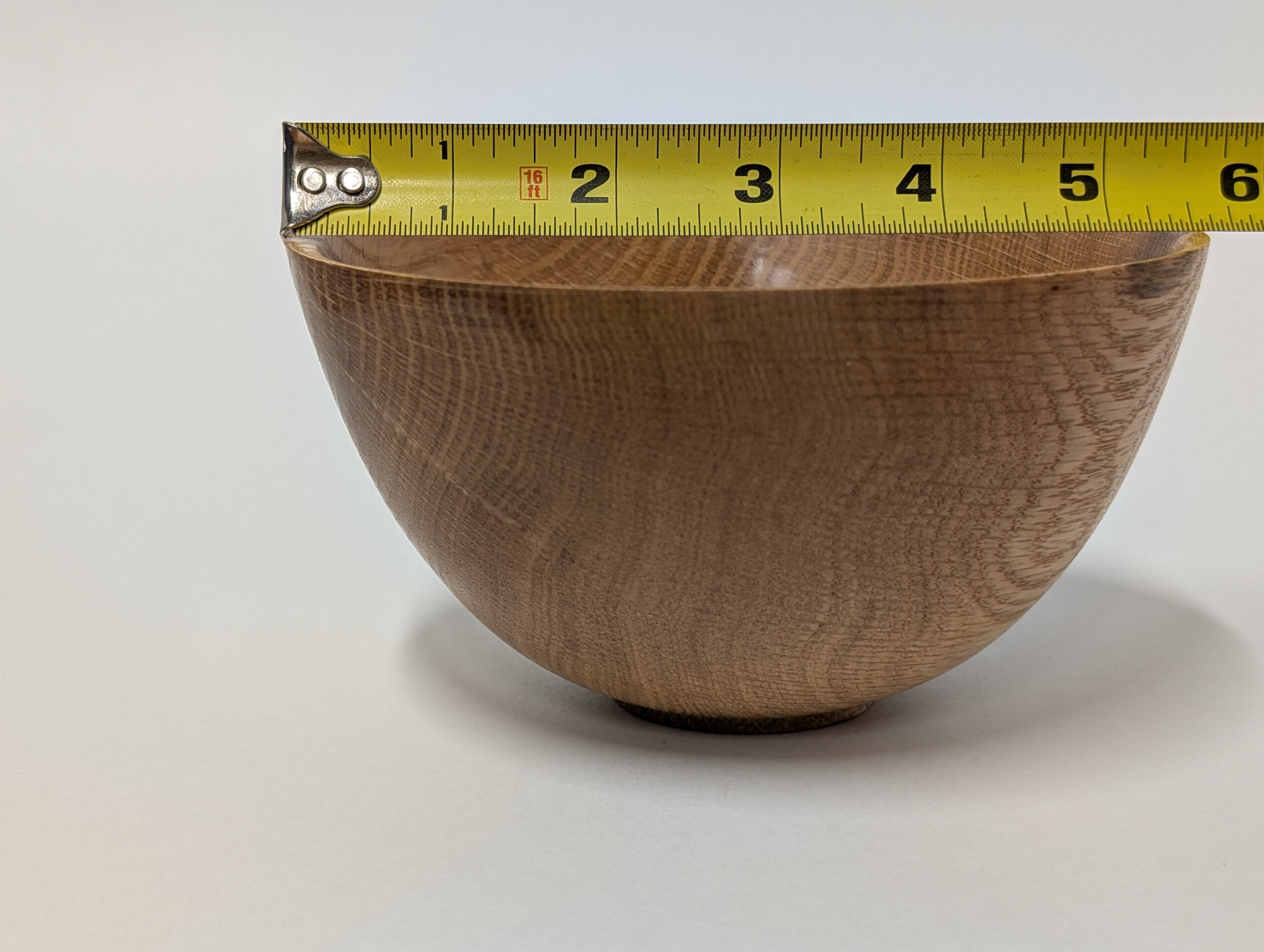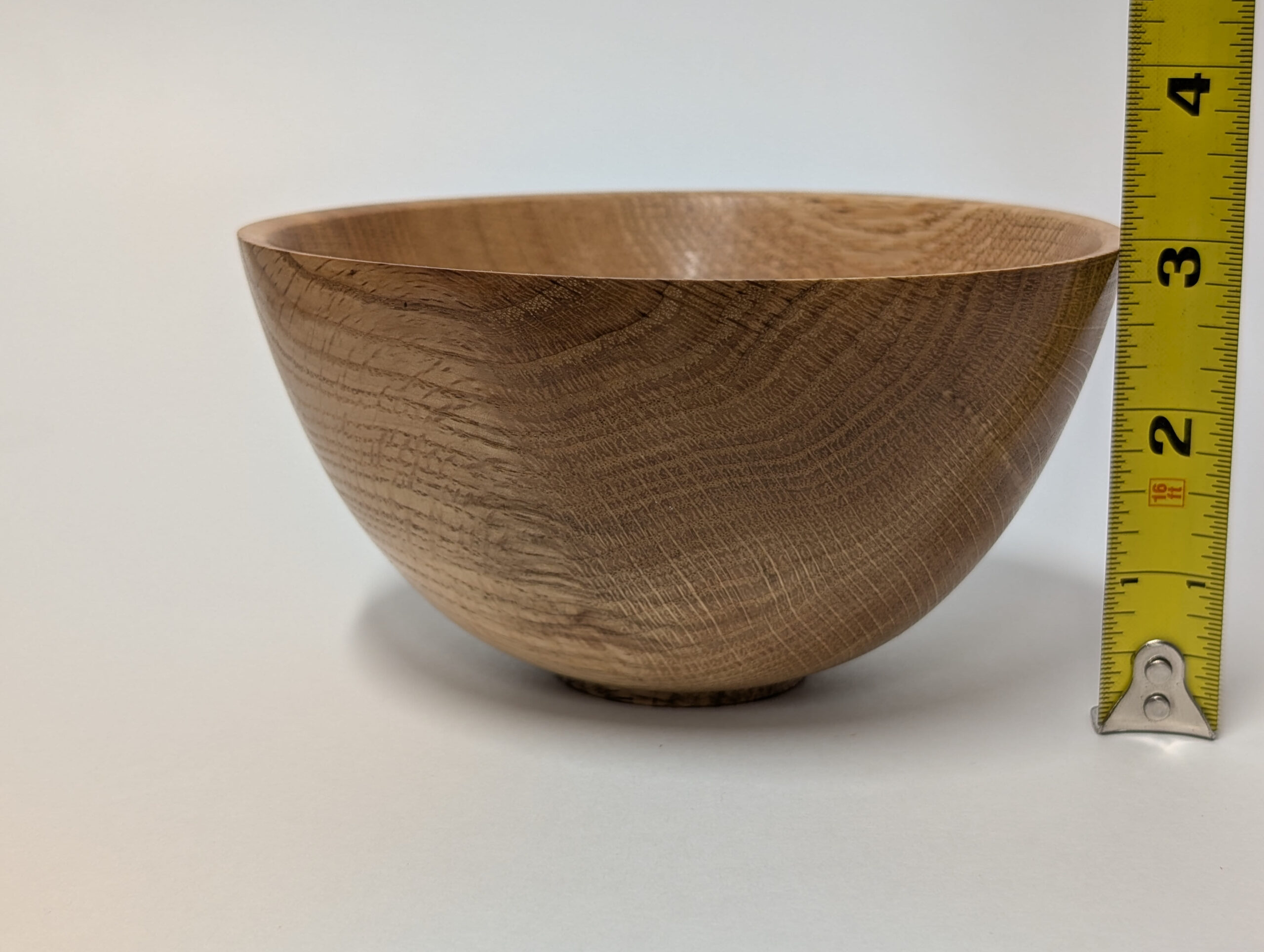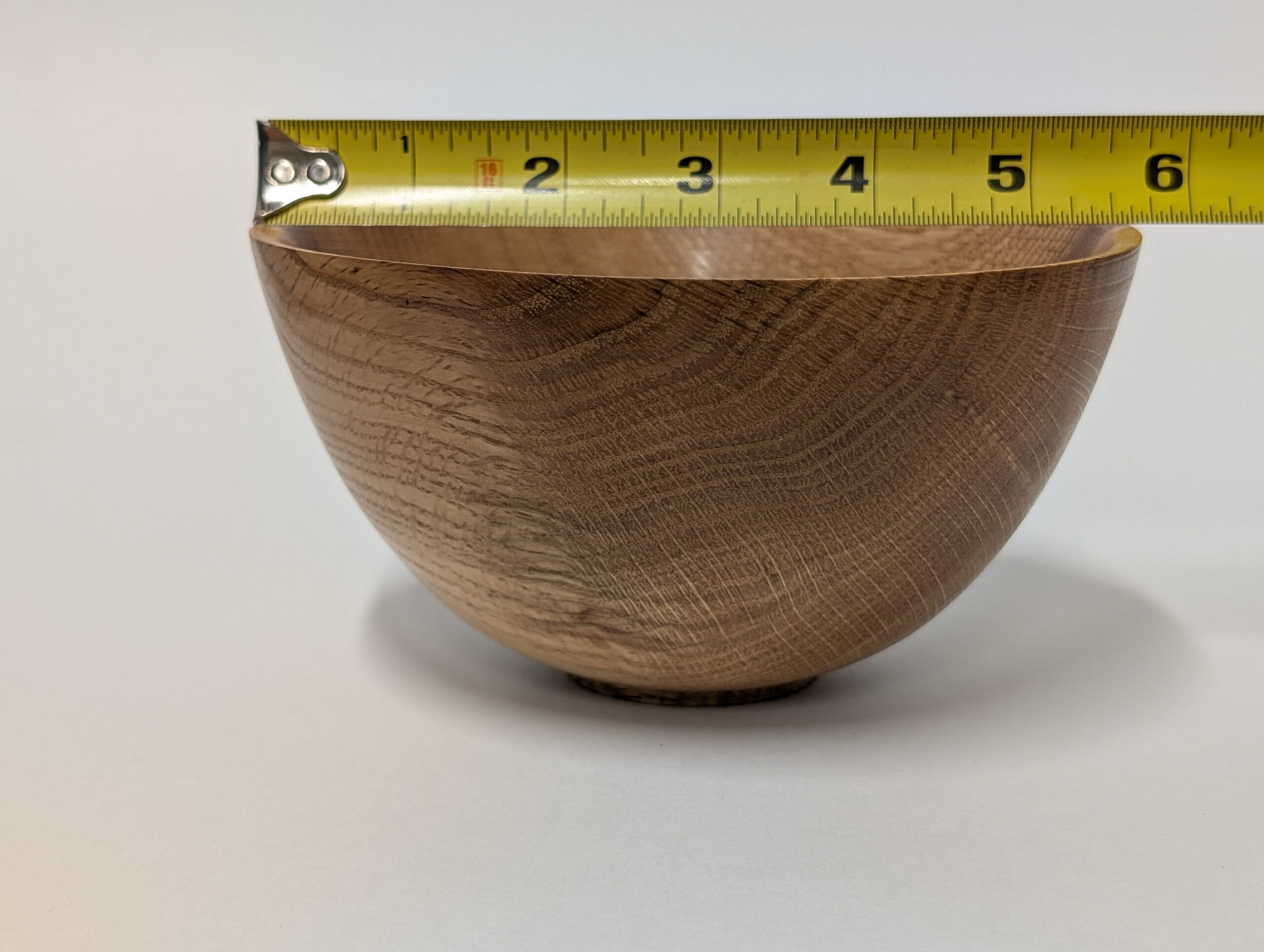 Oak wood bowl. Dimensions: Approximately 5.625 inches in diameter, and 3 inches in height. Finished with walnut oil and carnauba wax.