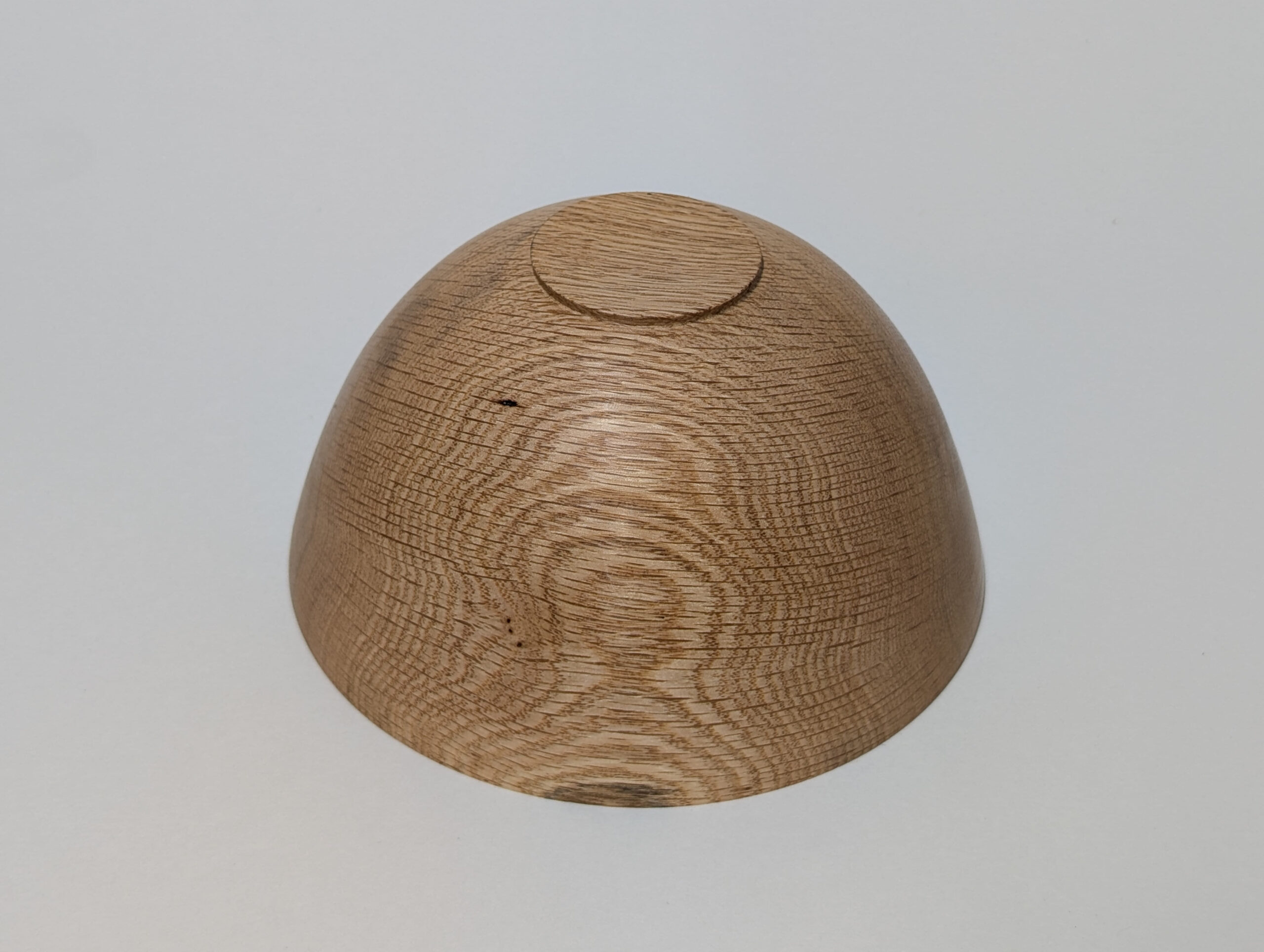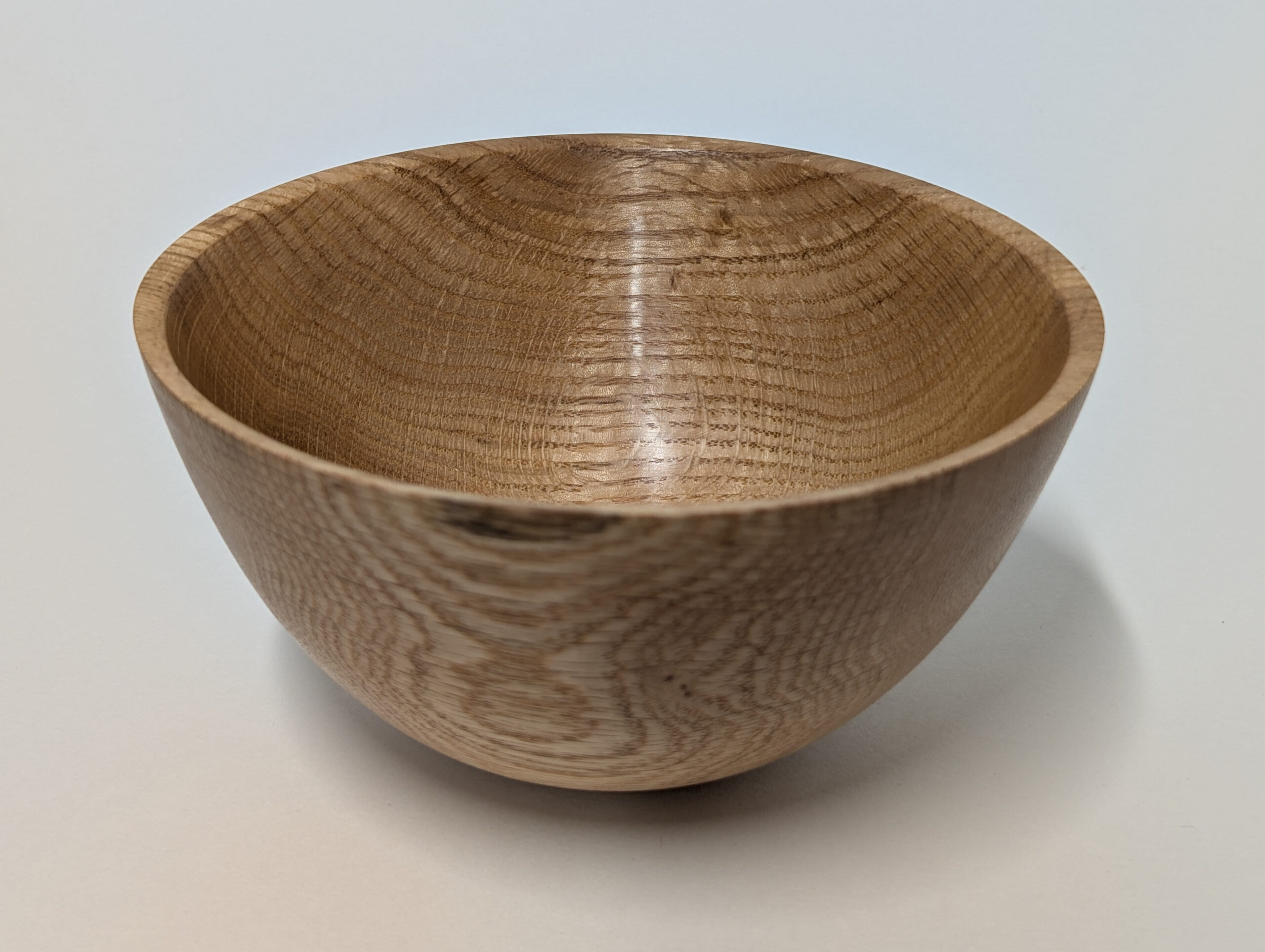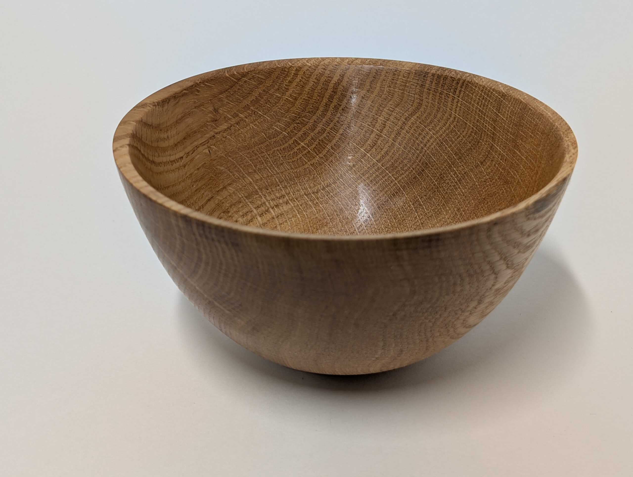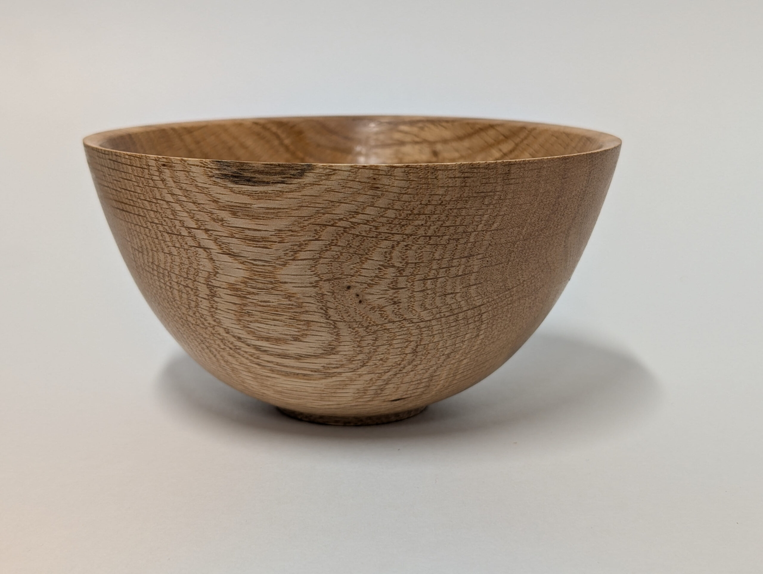 Oak wood bowl. Dimensions: Approximately 5.625 inches in diameter, and 3 inches in height. Finished with walnut oil and carnauba wax.