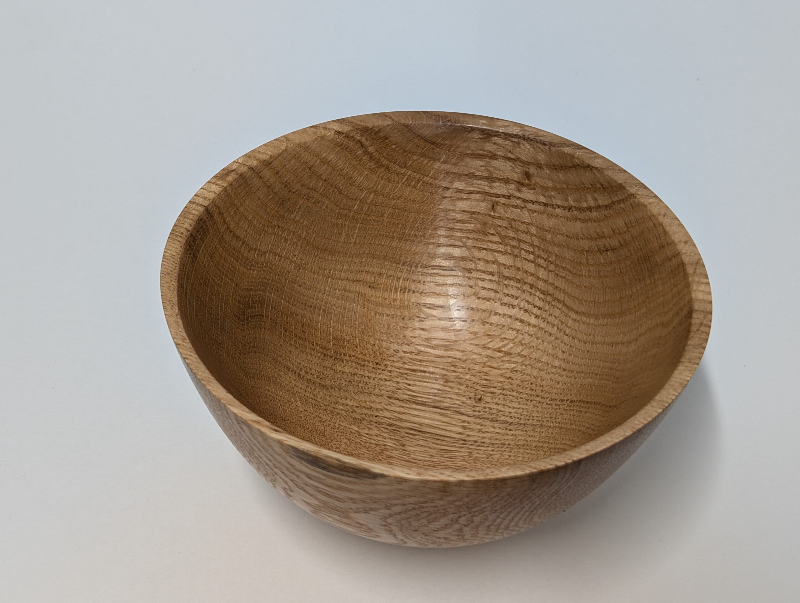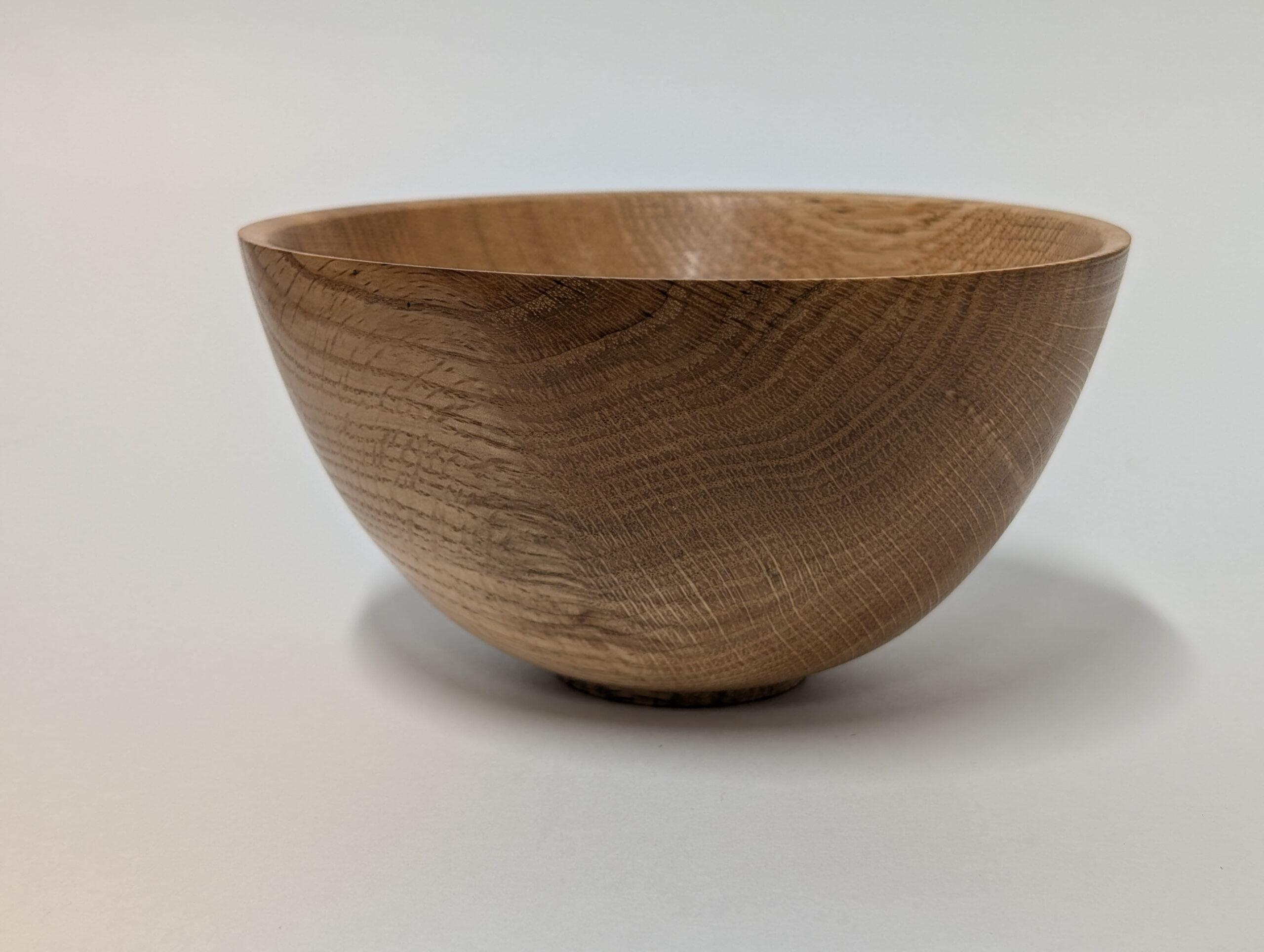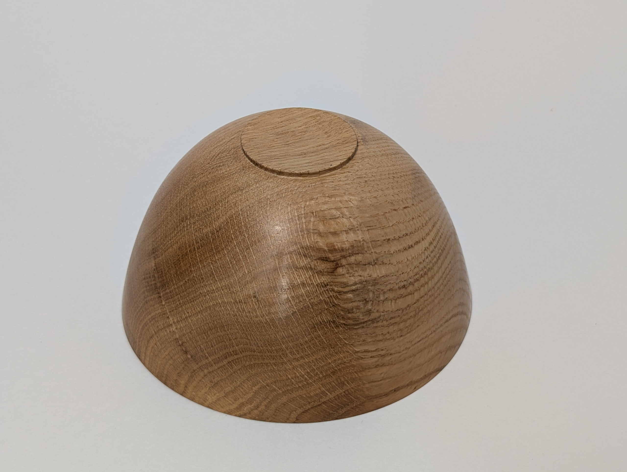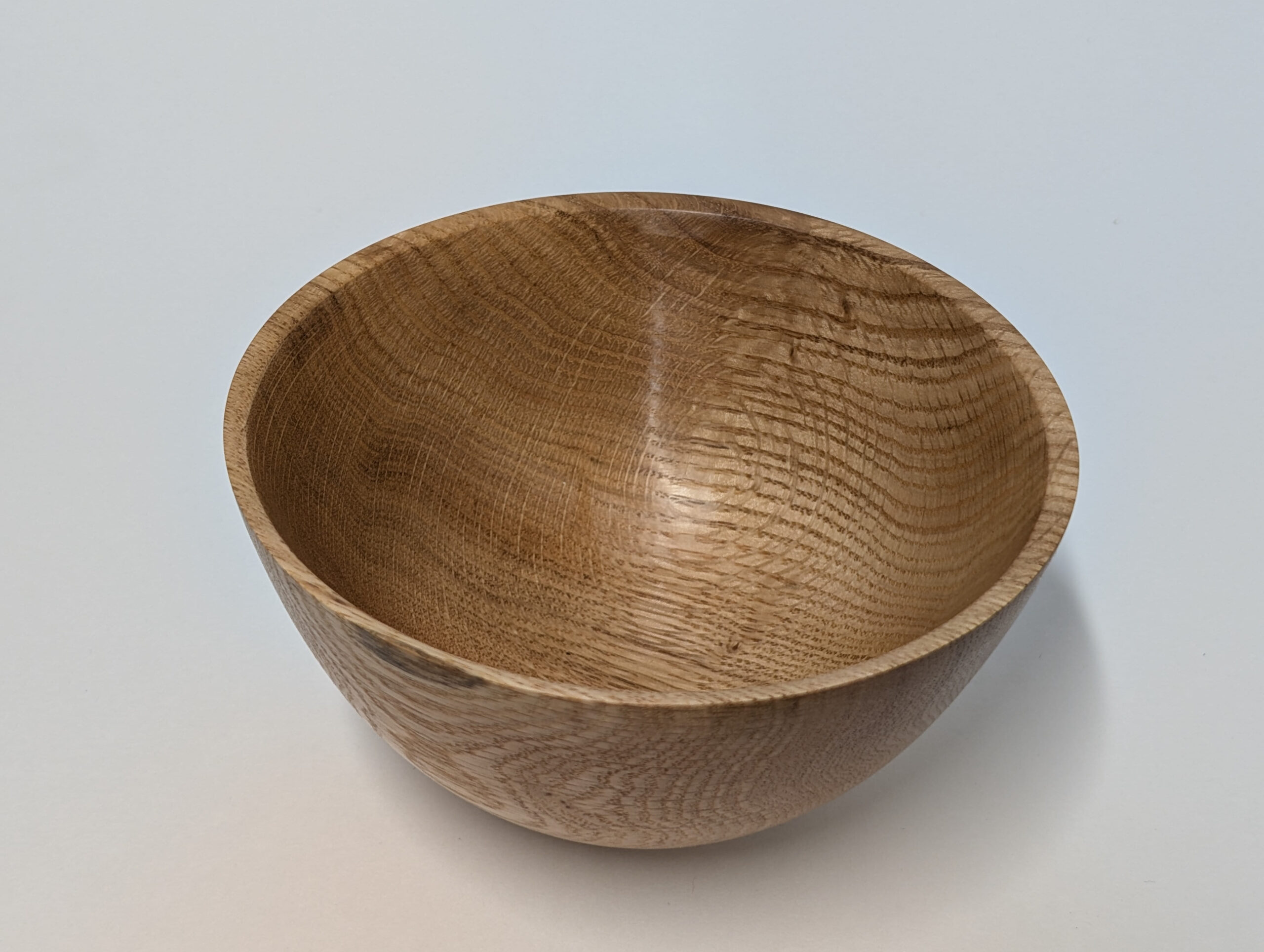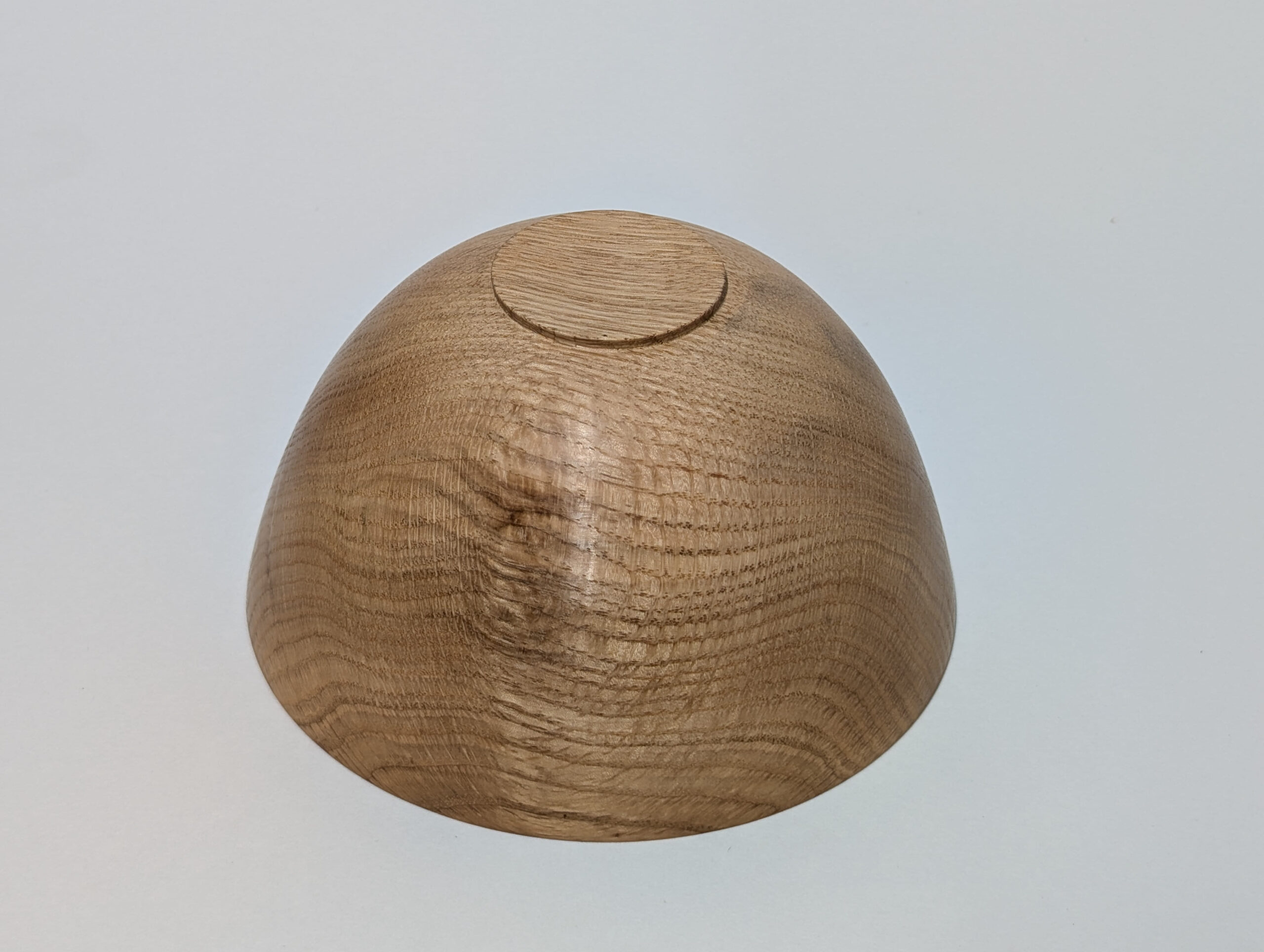 Oak wood bowl. Dimensions: Approximately 5.625 inches in diameter, and 3 inches in height. Finished with walnut oil and carnauba wax.