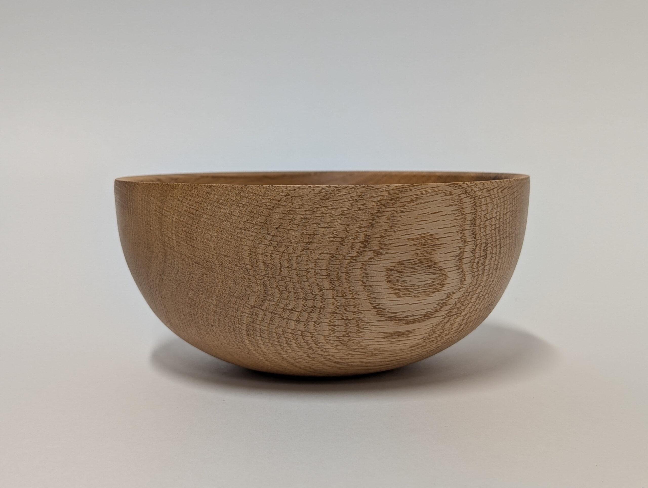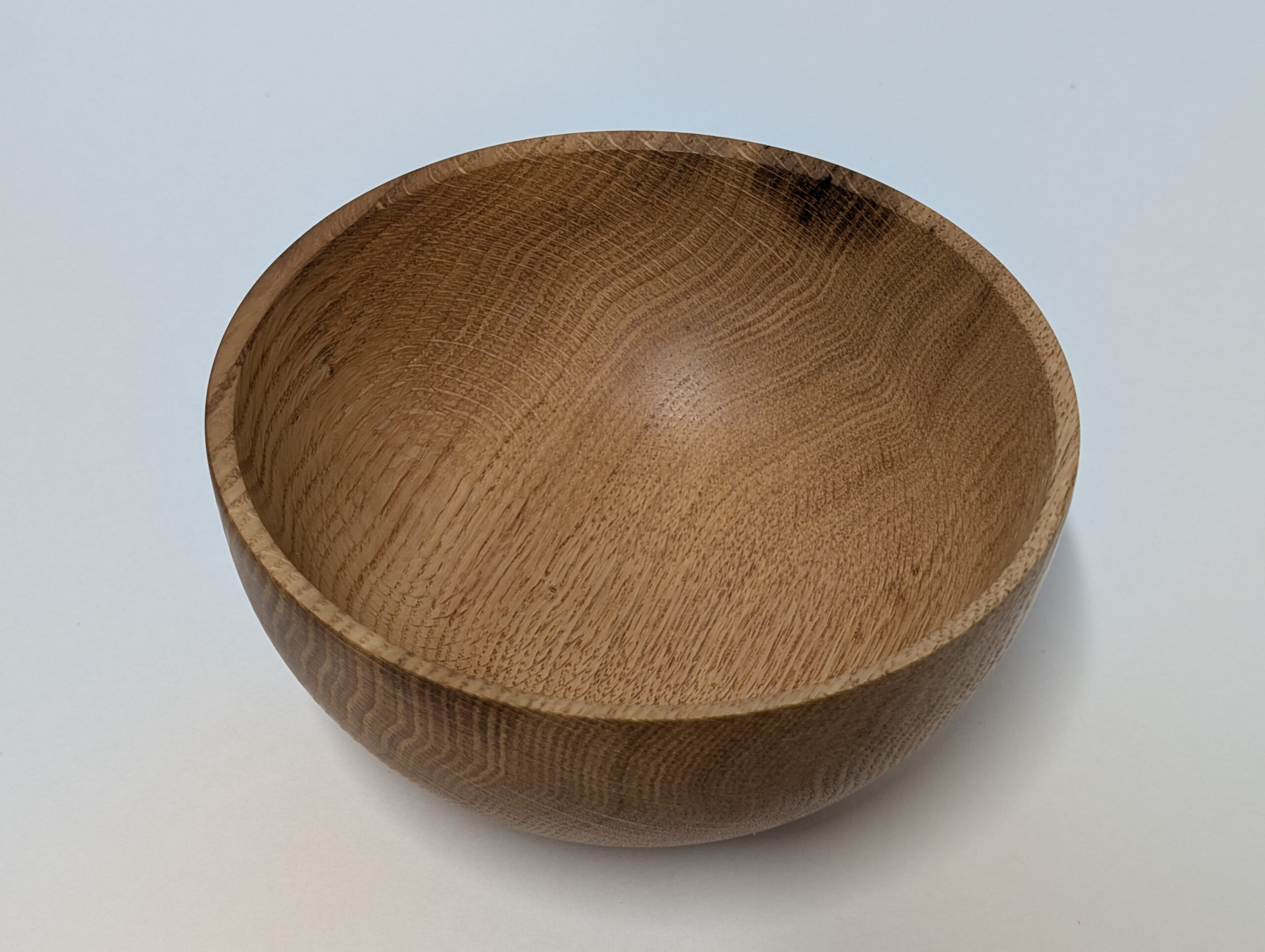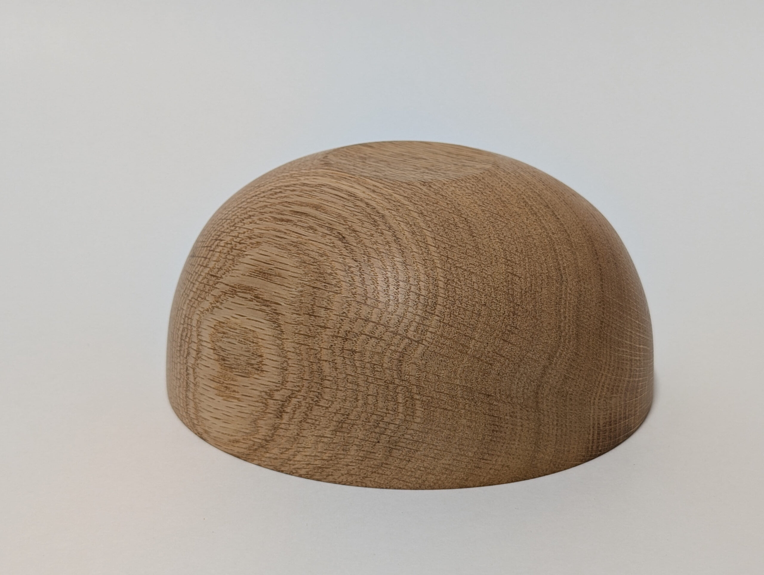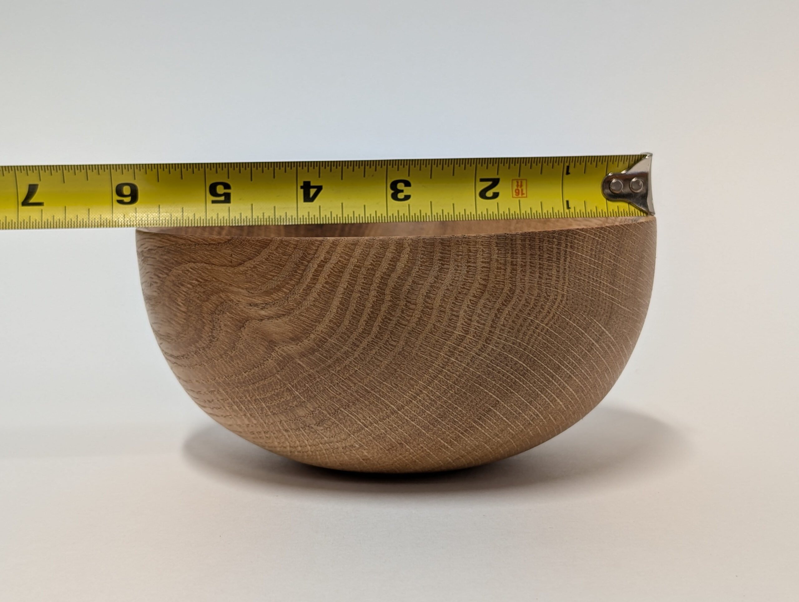 Oak wood bowl. Dimensions: Approximately 5.875 inches in diameter, and 2.75 inches in height. Finished with walnut oil and carnauba wax.