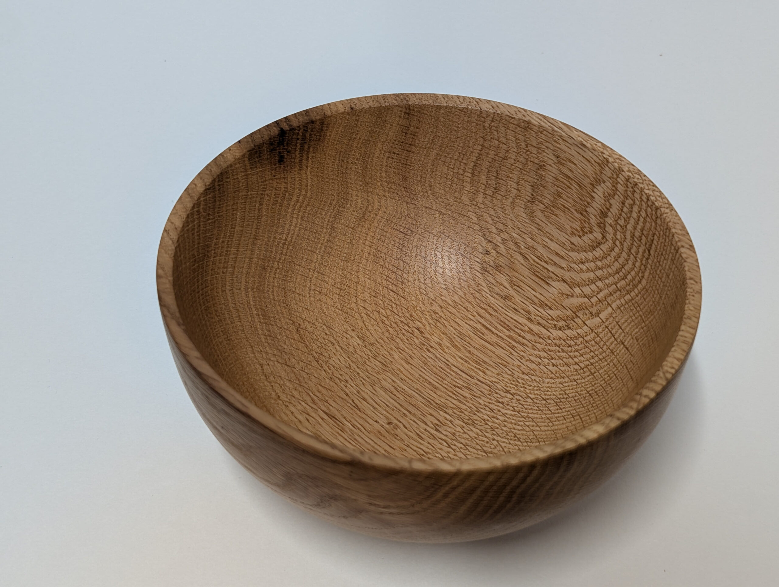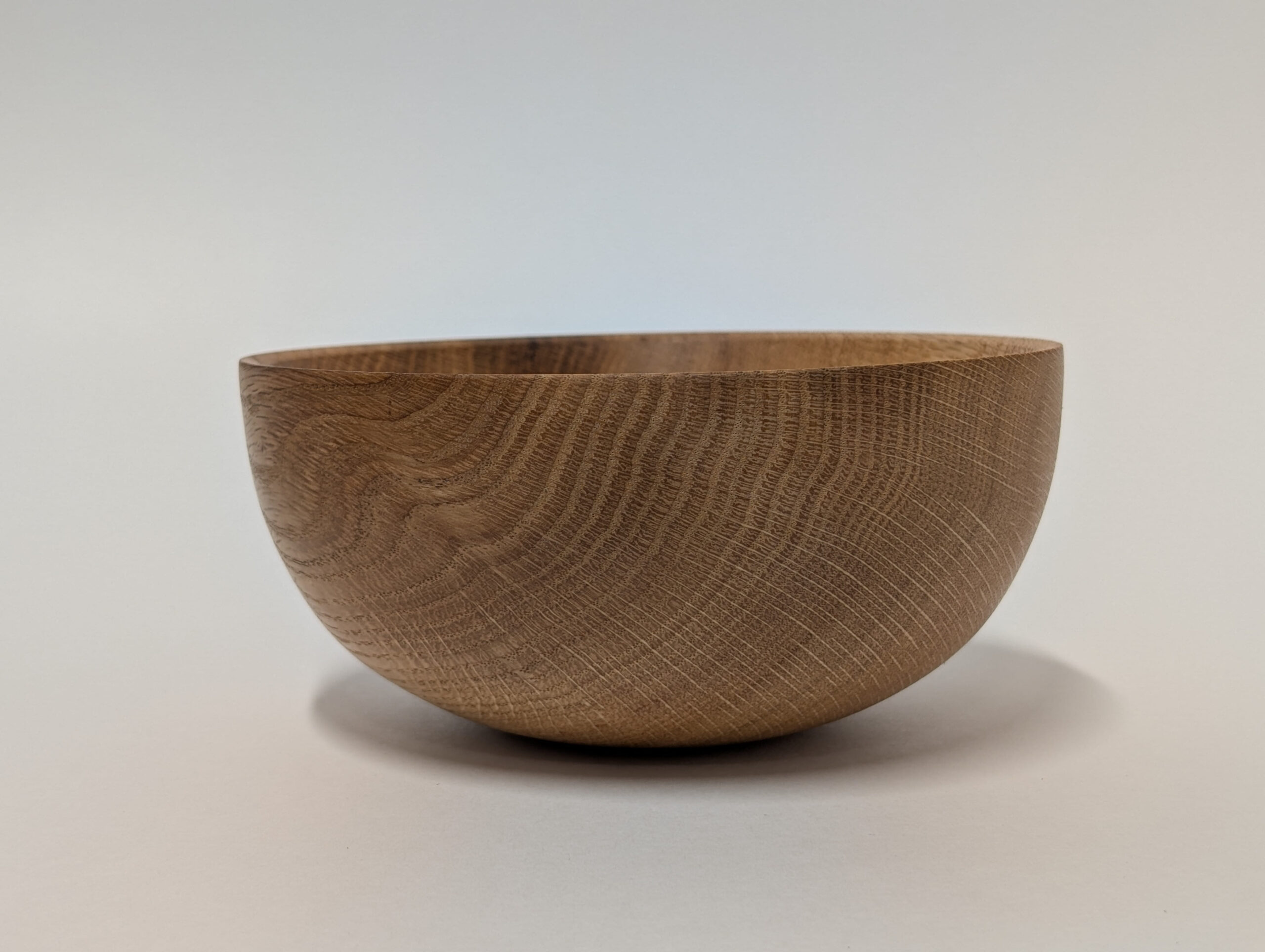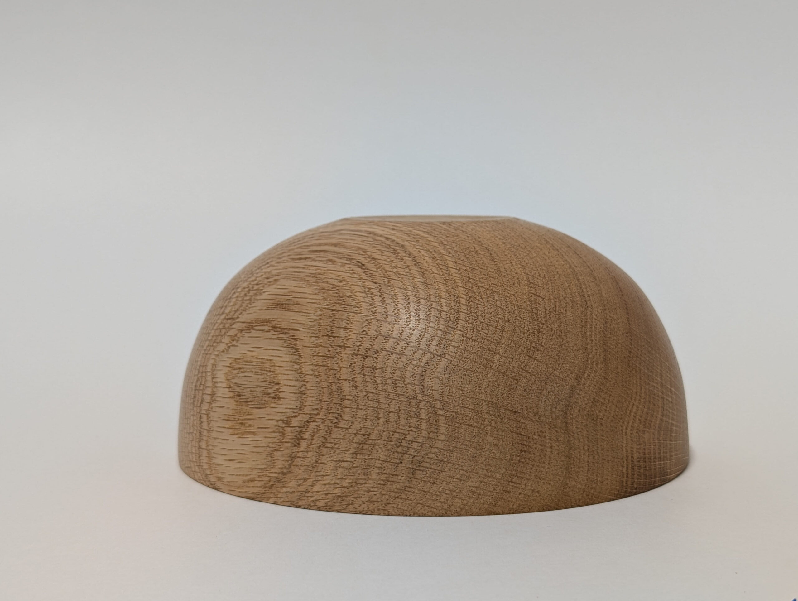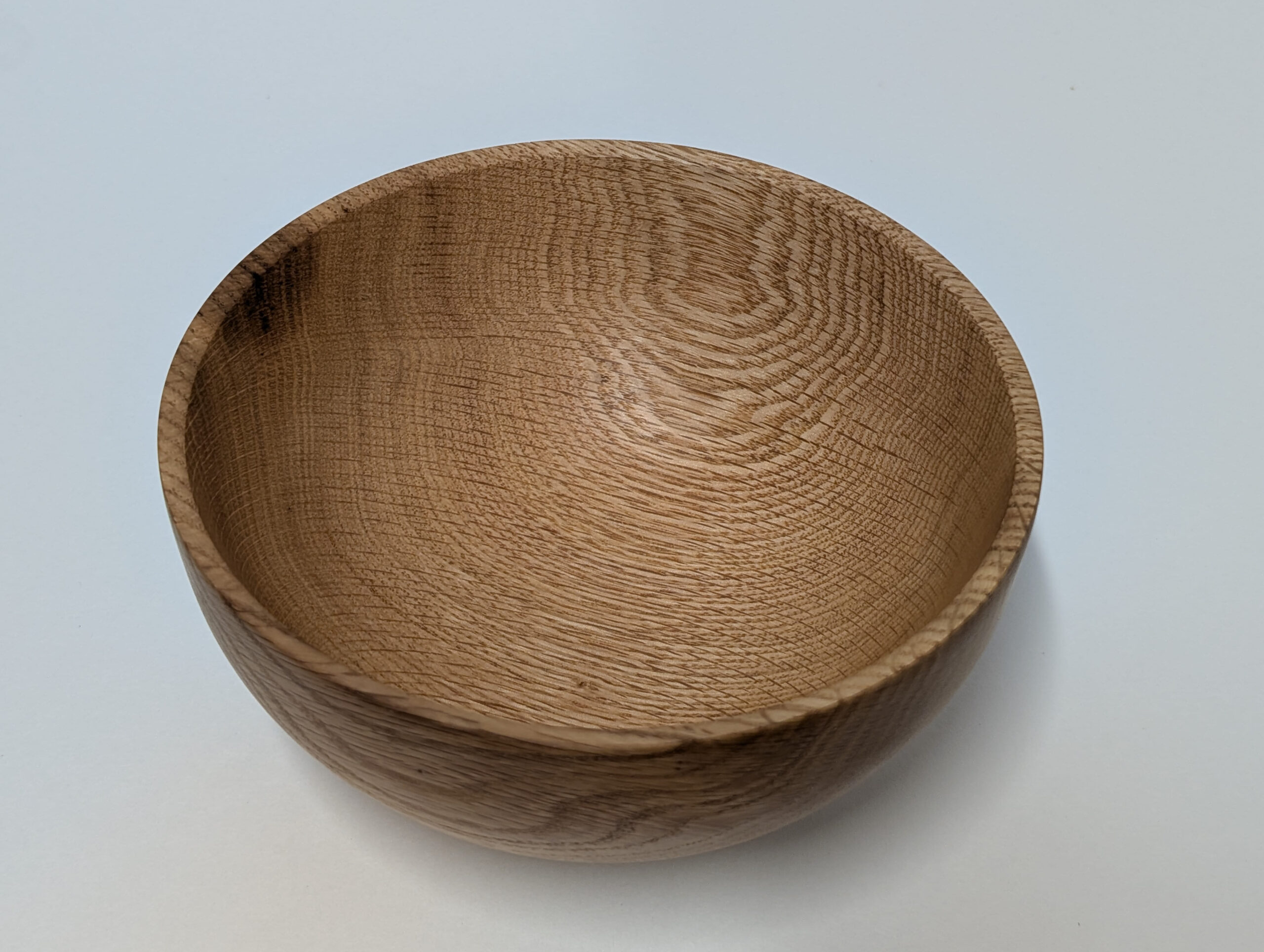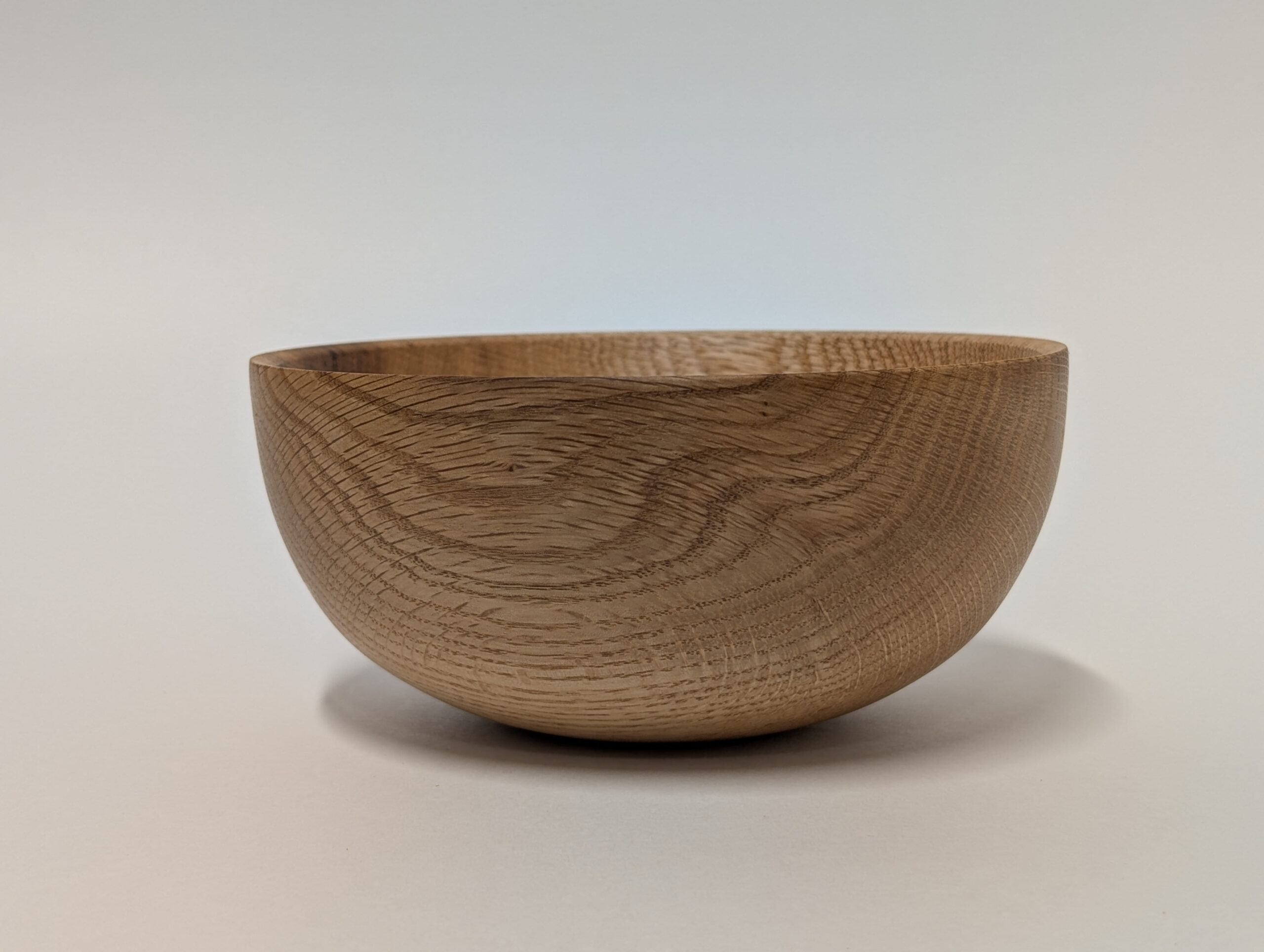 Oak wood bowl. Dimensions: Approximately 5.875 inches in diameter, and 2.75 inches in height. Finished with walnut oil and carnauba wax.