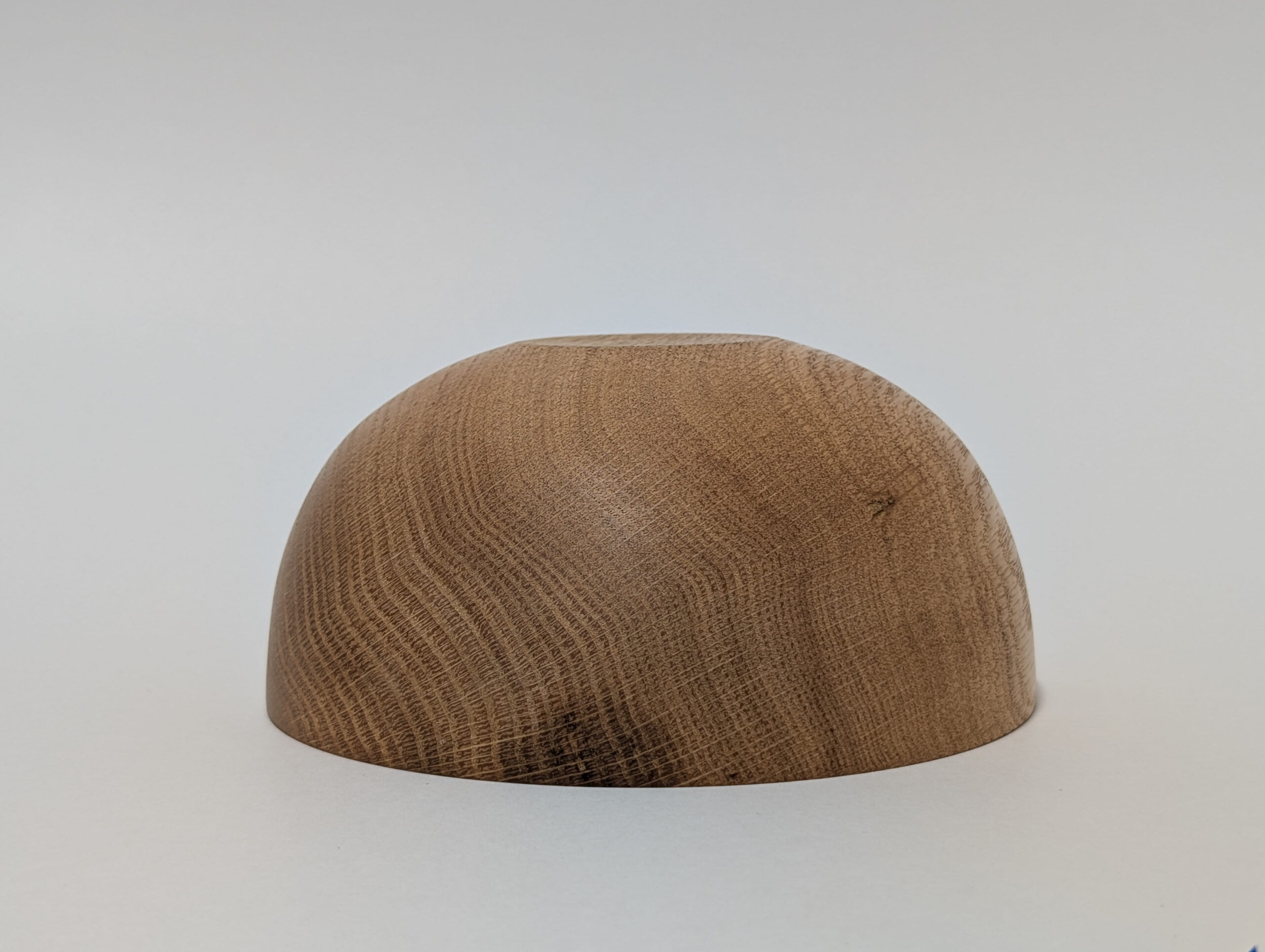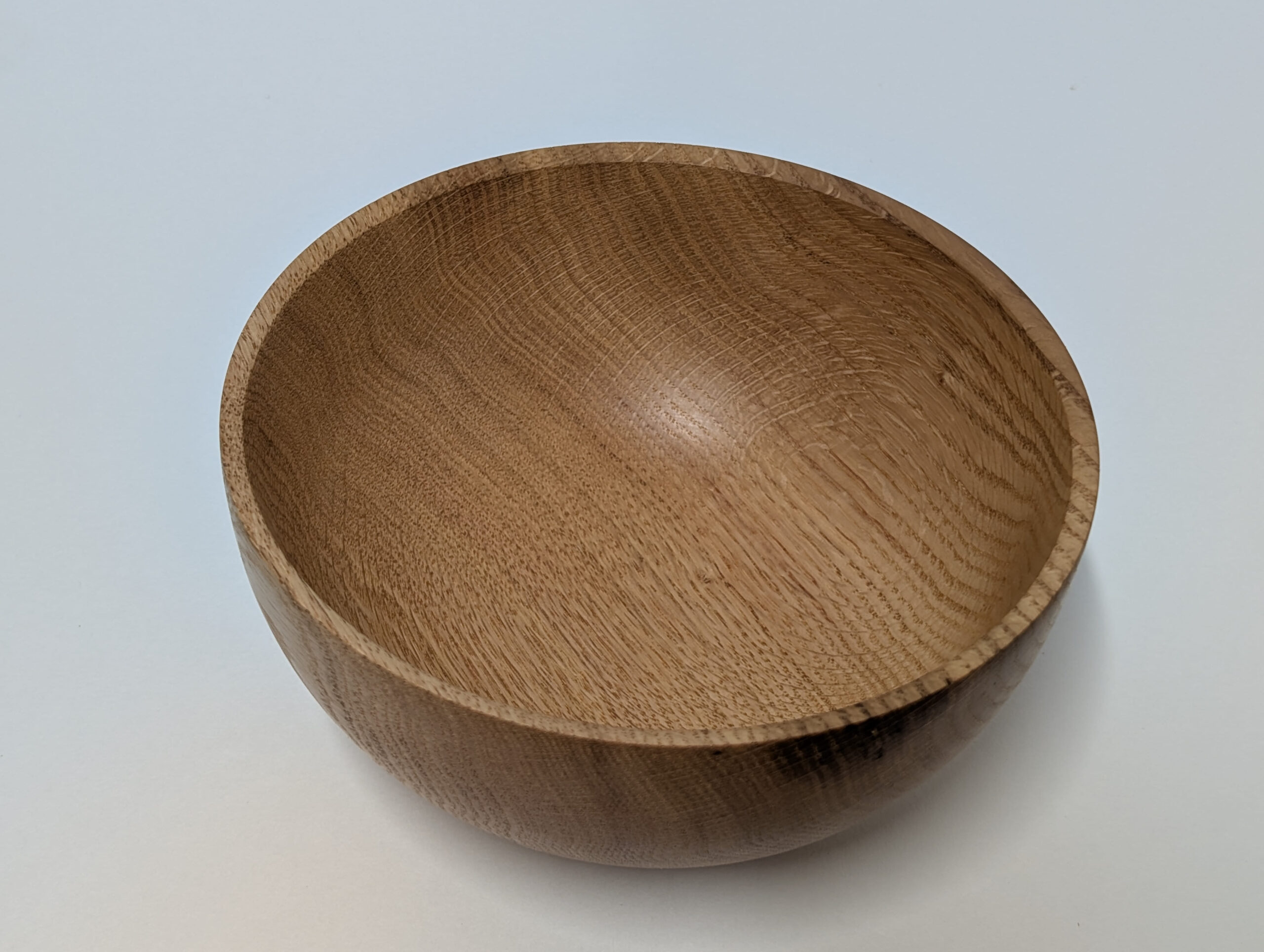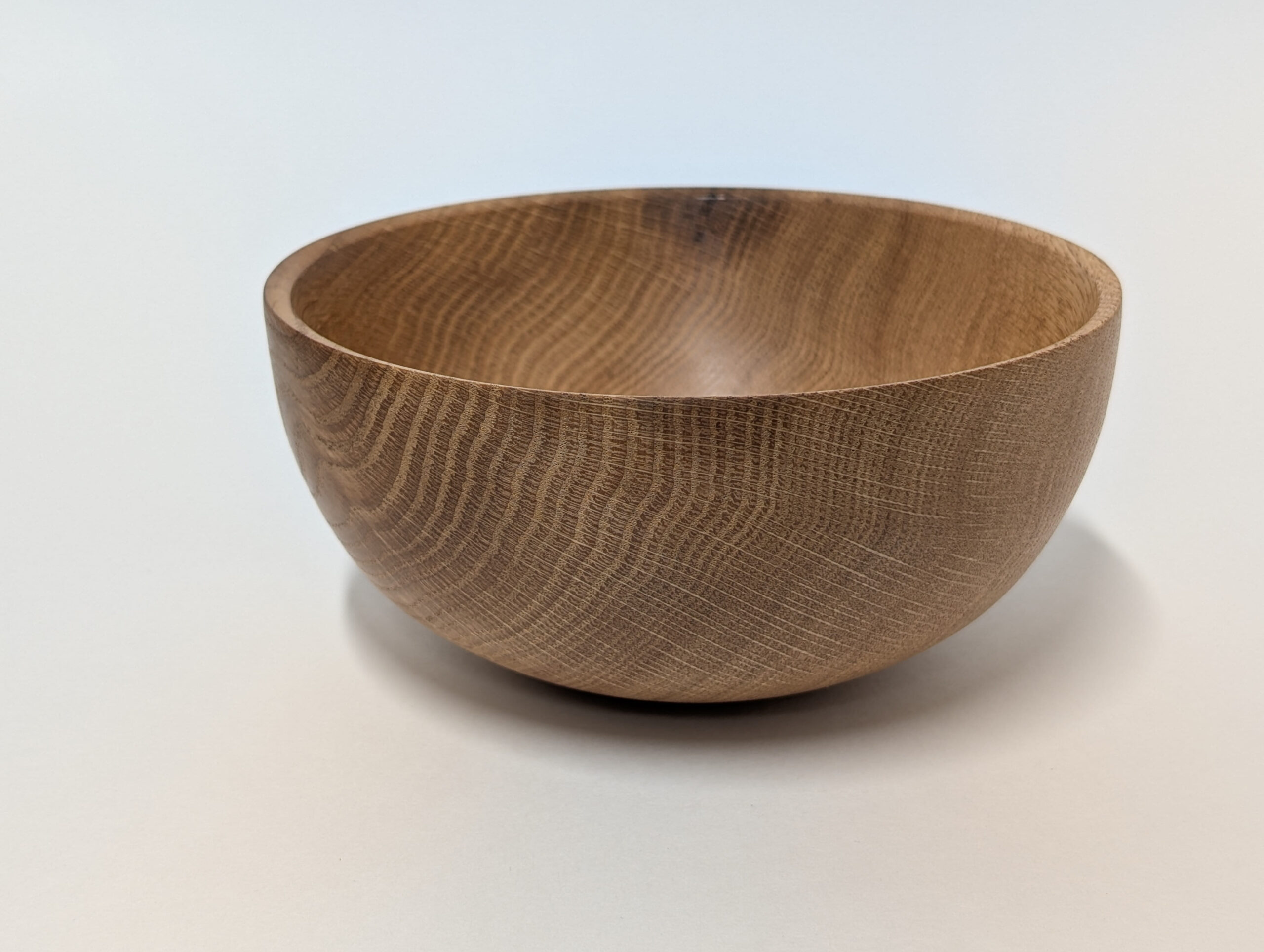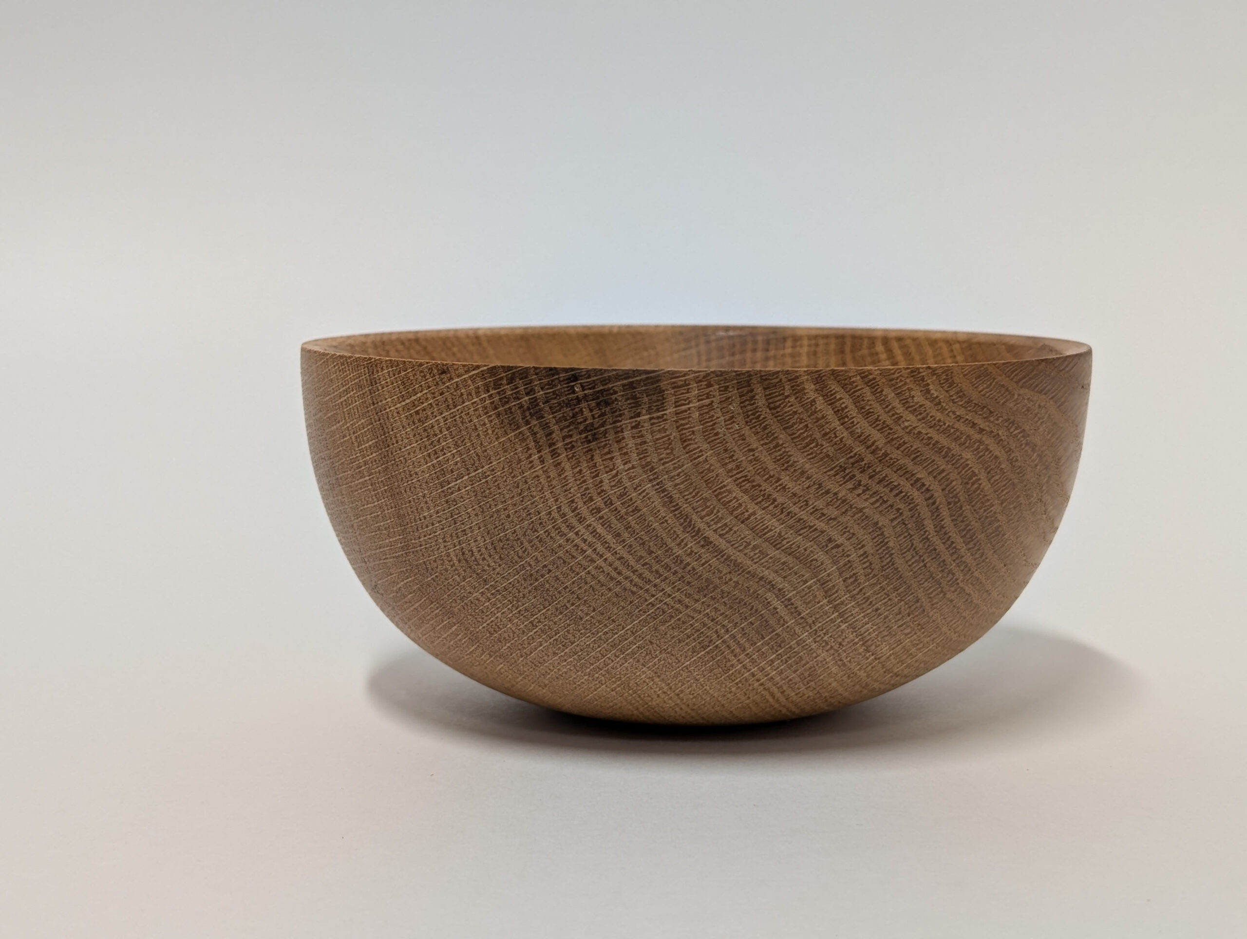 Oak wood bowl. Dimensions: Approximately 5.875 inches in diameter, and 2.75 inches in height. Finished with walnut oil and carnauba wax.