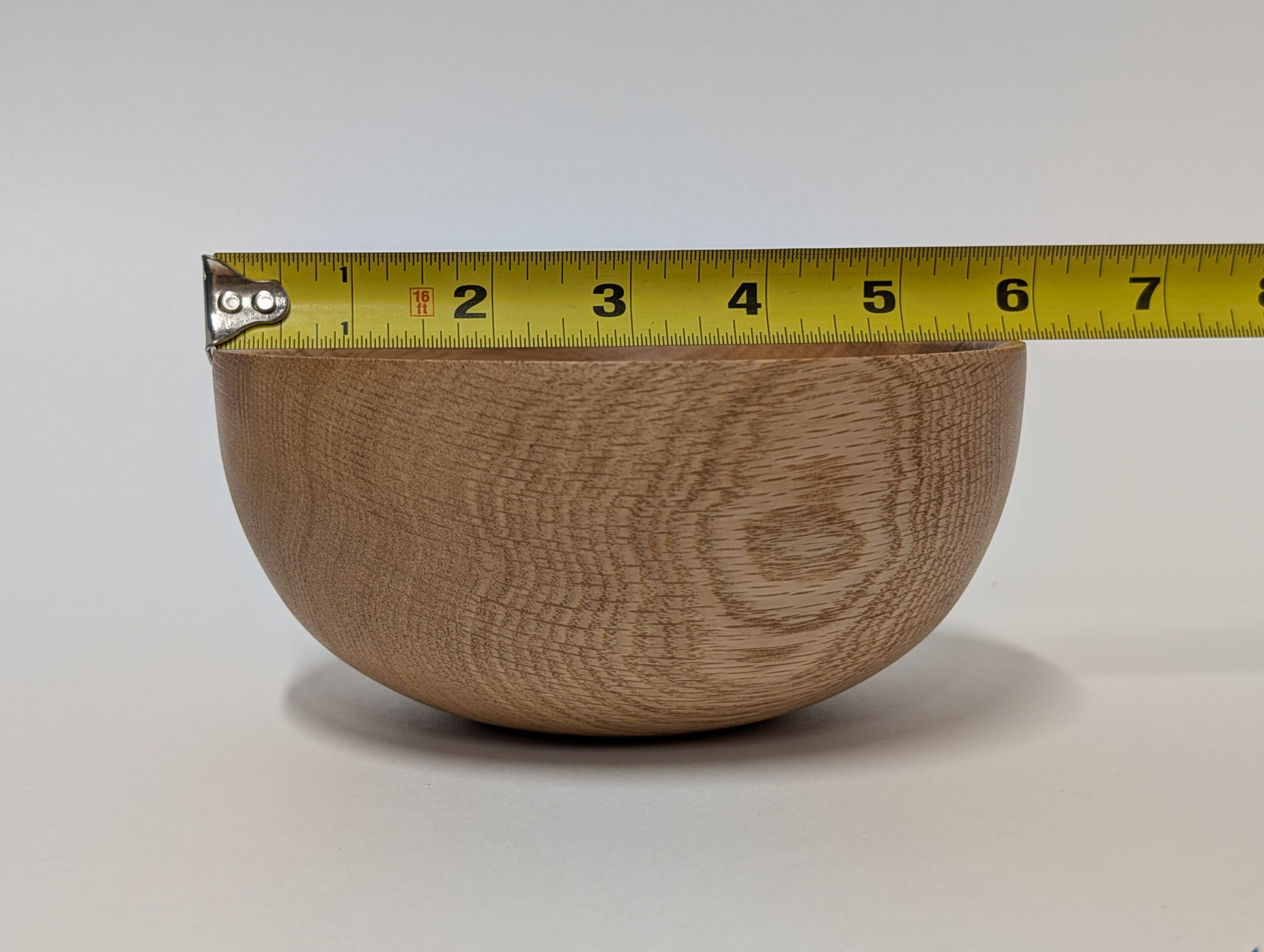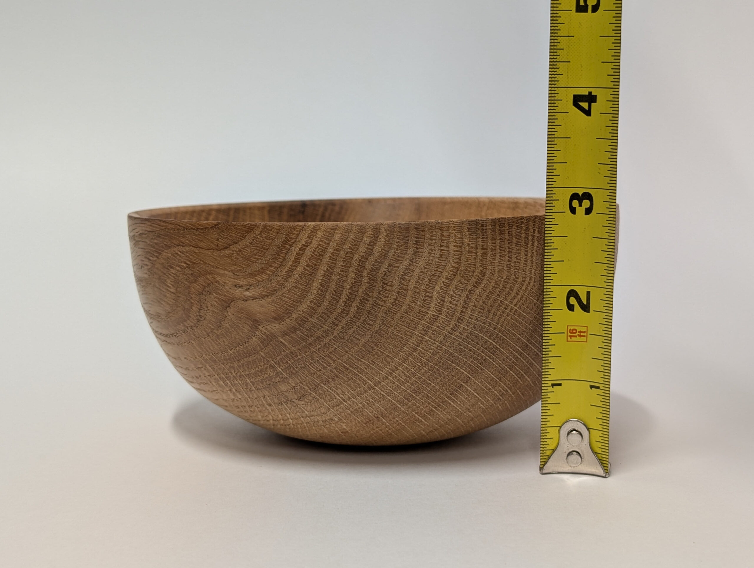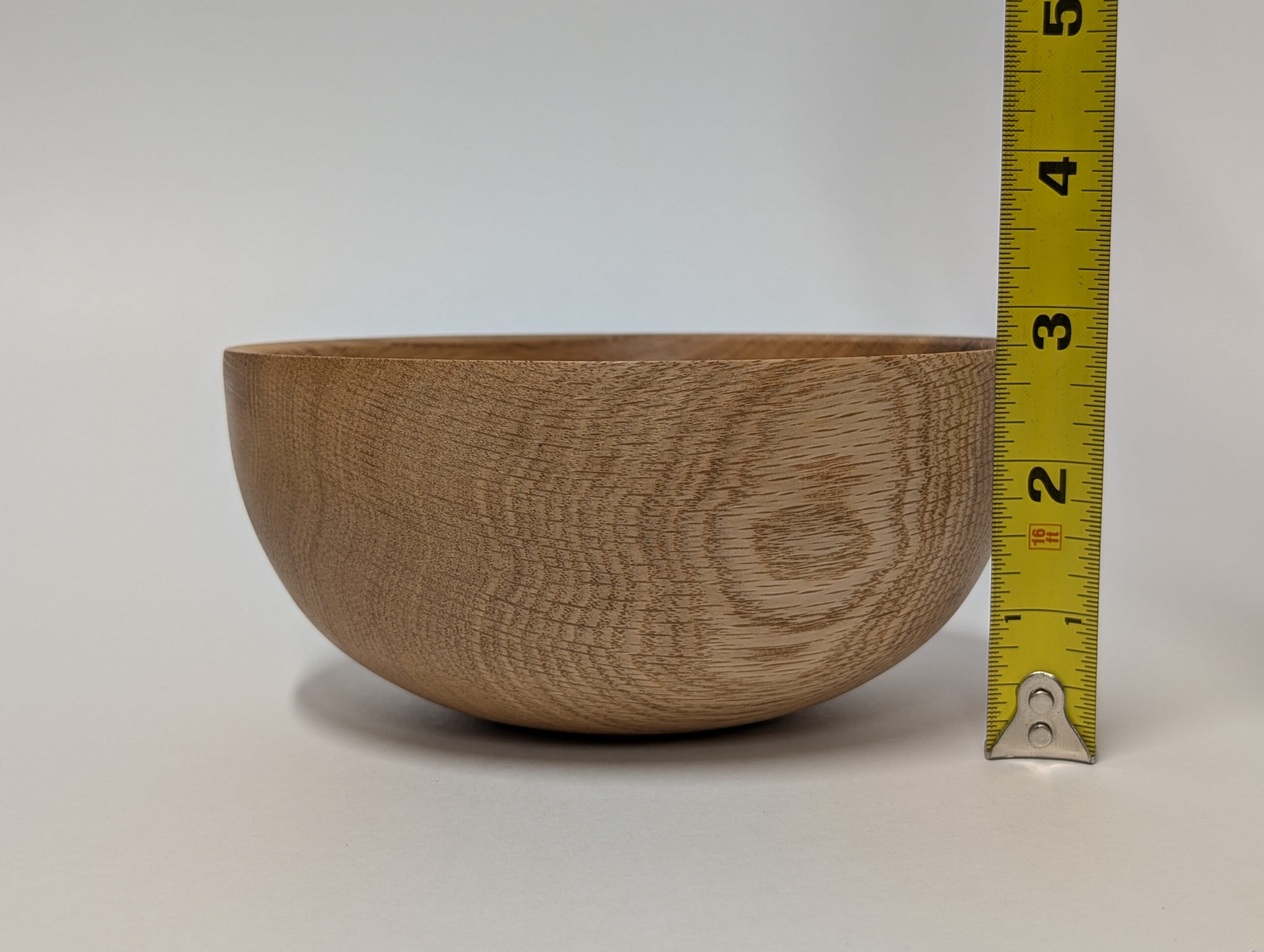 Oak wood bowl. Dimensions: Approximately 5.875 inches in diameter, and 2.75 inches in height.